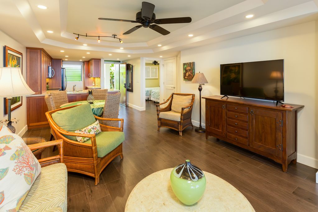 Our 2 BR apartment has been completely renovated with new furnishings and authentic Hawaiian hospitality. New LCD TV\'s in the Living Room (40 inch; Smart TV connected to the internet)(Blu-Ray Player), Master Bedroom (27 inch; w/Apple TV) and guest bedroom (27 inch; w/Apple TV). THREE LCD TV\'S TOTAL!