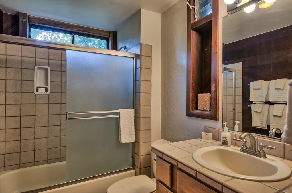 DESCRIPTION: A large (1,250 square feet!!) two bedroom, three bath custom redwood townhouse which we built in 1977 as a family retreat --with a fully-equipped kitchen and laundry. This is a comfortable beach house and we have done remodeling, refurnishing and updating recently. The master bedroom has a king bed, the second bedroom has twin beds and a queen bed. The duplex is on three separate levels, each with its own private bathroom. The adjoining townhouse is the only other unit on the property, and is also available for rent for larger groups.