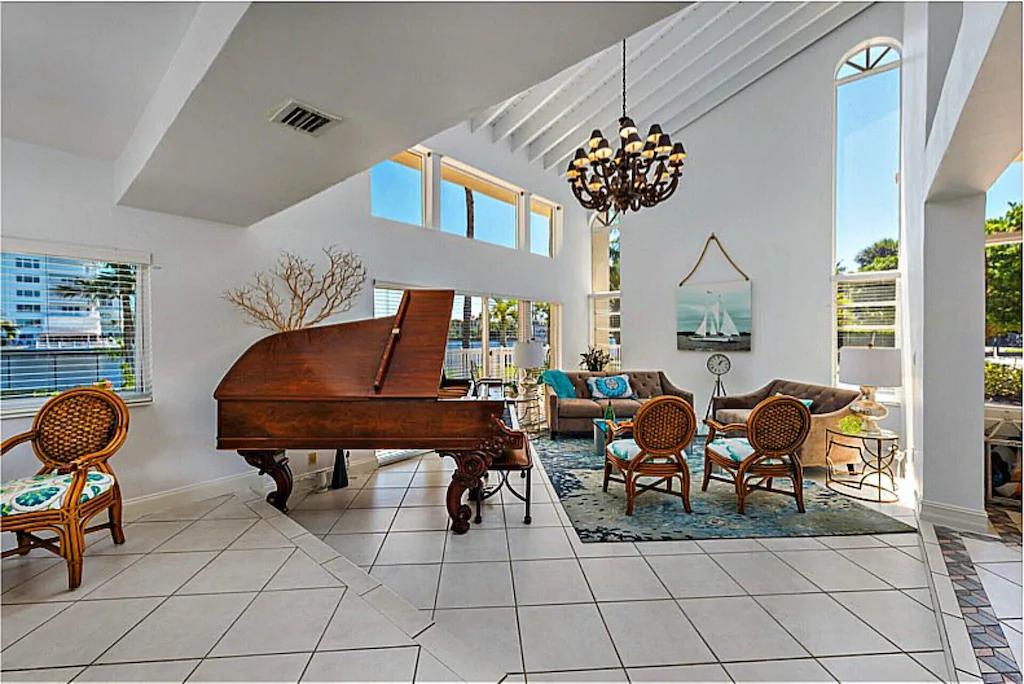 Your getaway is a sun filled home with water views from most every room; it is designed and decorated to provide elegant comfort and convenience. The backyard is spacious and sunny and surrounded by numerous coconut palms that sway in the gentle breezes. A covered back porch with comfortable couches, a gas grill and and an outside eating table overlooks a 16 x 32 ft. in ground pool. There’s also a hammock under mature trees for an afternoon siesta, and a basketball hoop onsite equivalent to a 1/2 court.