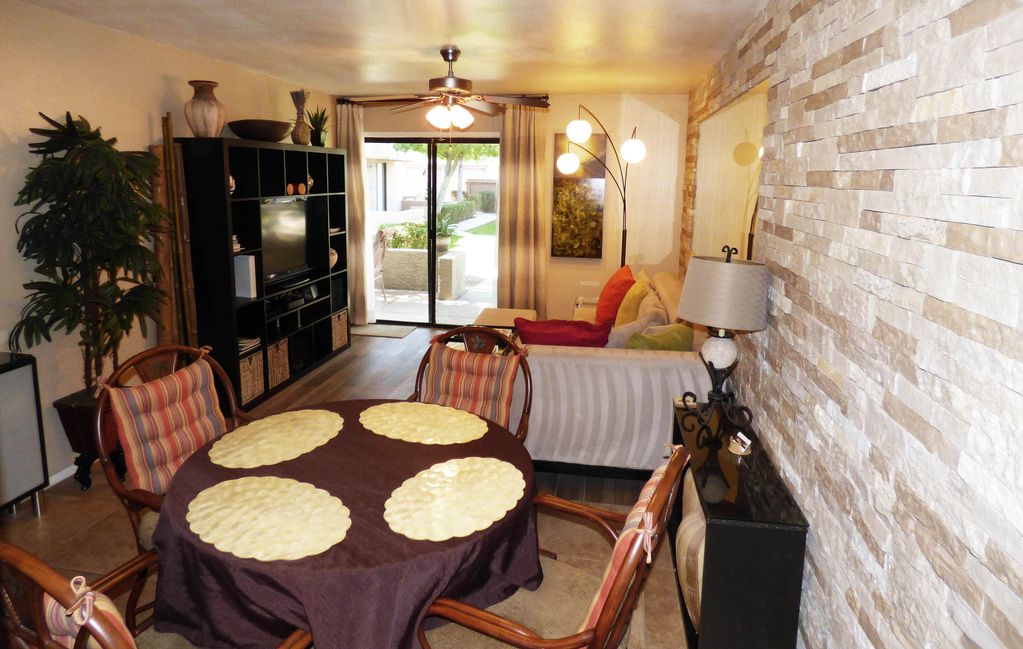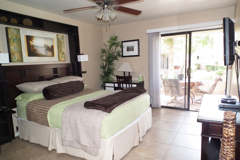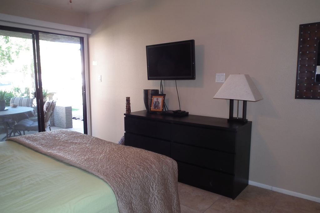 MASTER BEDROOM: The master bedroom offers a firm, queen plush top mattress. Enjoy the 39\' flat-screen TV from bed. Wake up in the morning and open the Arcadia doors to the back patio. Have your breakfast seated at a comfortable cushioned patio table set surrounded by exotic desert plants .