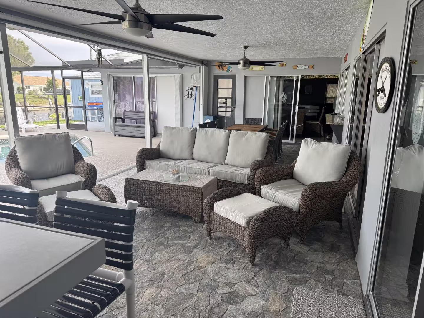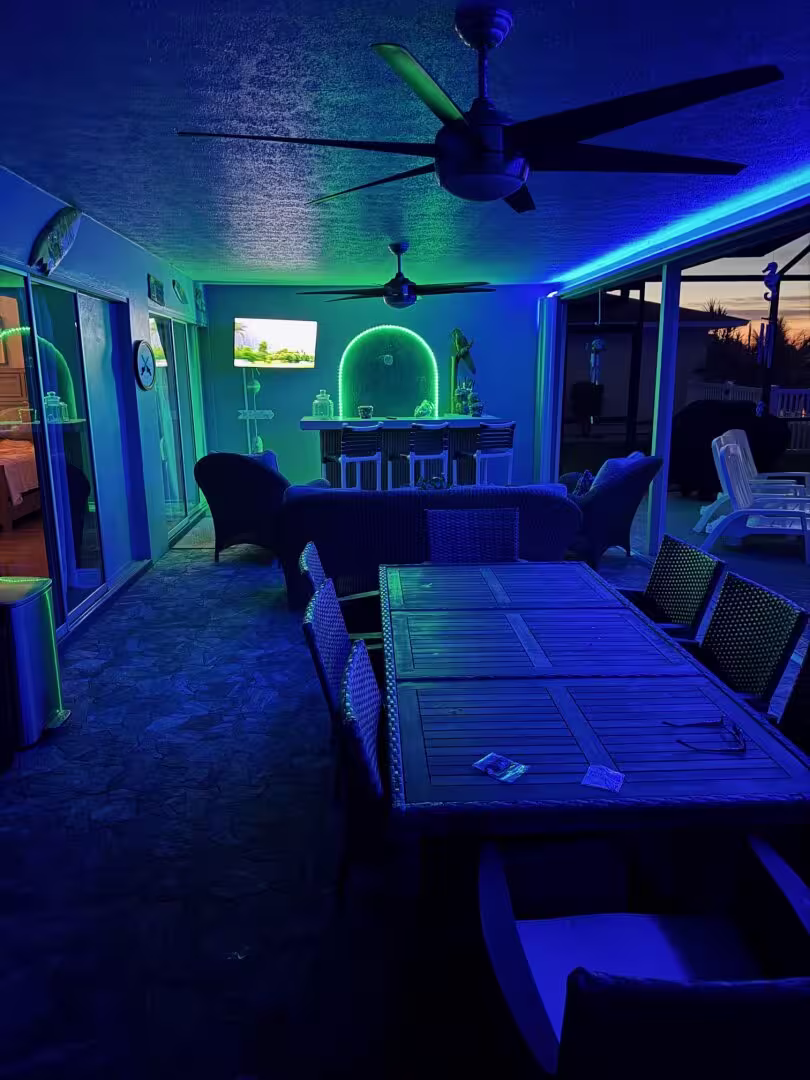 Perfect house for our family. Very inviting. Great location to many restaurants/stores. On a canal in a quiet neighborhood. Absolutely loved the covered porch and lanai. Spent most our time soaking up the sun in the pool or on the dock. Enjoyed being able to have meals and relax outside while watching TV. Marty was very kind and friendly and super easy to deal with. We will definitely be back!