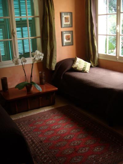 Special deal for four week booking in August Situated in Juan les pins, famous for it jazz festival, sand beaches, nightlife and fine cuisine the apartment is ideally located for exploring the whole of the French Riviera with excellent links to public transport and garanteed free streetparking. 5oo metre from the beaches and restaurants. Two minutes walk from supermarket,bakery,pharmacy etc. two minutes from the bus stop and train station but still calm as it is located on a private street with no thru traffic. The apartment is the ground floor of a two apartment 1950 villa with access to a garden complete with lemon, orange and grapefruit trees giant cactus barbecue, tree house and an above ground swimming pool for a refreshing dip.The apartment consists of two bedrooms two singles one double with a possible additional folding camp bed for larger families. Kitchen is well equipped and modern, dishwasher , washing machine, microwave oven with access onto the garden for those who like their morning croissants and coffee al fresco. The bathroom is appointed in a period style with a victorian bath tub with overhead shower vintage style sink, bidet and toilet and varnished mahogany floor. The oriental twin bedroom decorated with rich provencal tones has two singles , built in wardrobe , windows onto the garden. The double bedroom with its French doors opening onto the terrace overlooking the orange trees, is comfortable with a 1920 wardrobe, chest of drawers, easy armchair, plenty of space to store away your holiday clothes and relax. Next door is the sitting room dining room with French windows onto the garden and terrace. Decorated in a sunny yellow tone it is the perfect place for relaxing with a pre dinner cocktail before strolling down to one of Juan les pins many beach side restaurants, or having diner 'a la maison'. It has two sofas a dining table for six and a TV with DVD player. It provides a geat base for exploring the whole of the coast with the coastal towns of Nice Cannes VIllefranche Monaco Antibes Menton and Italy being easily accessible but also is ideal for just a spending a day at the beach or relaxing at 'home' . Excellent value for money this property provides comfort and space at a cost well below the marketprice SPECIAL RATES for 4 week bookings!