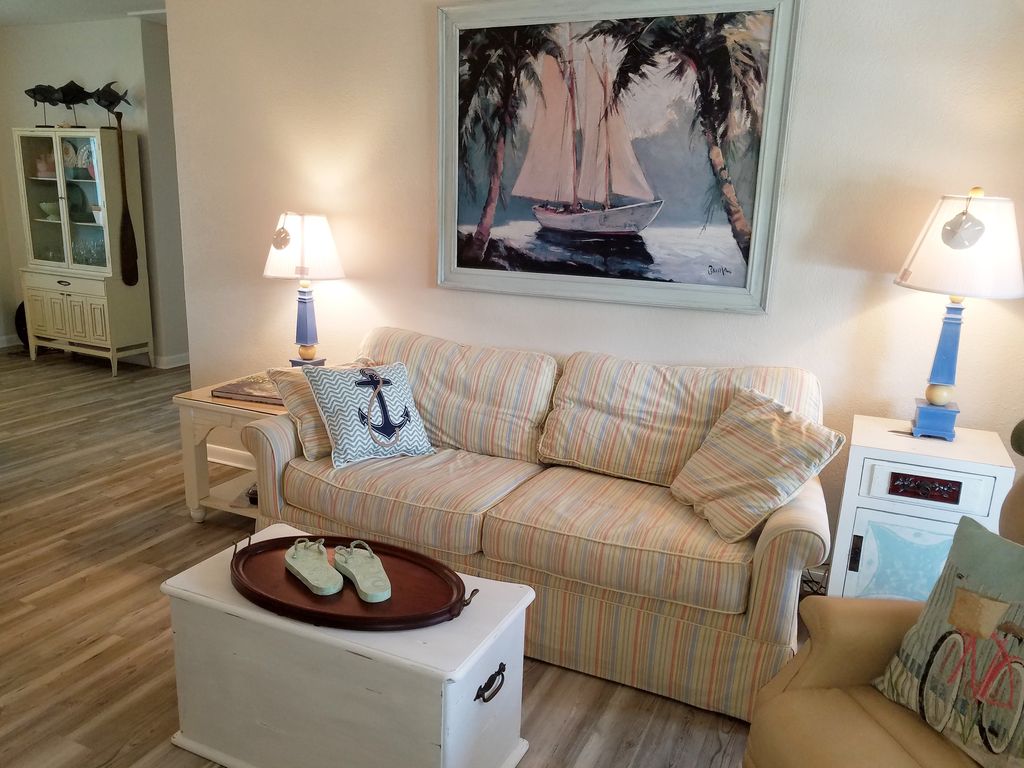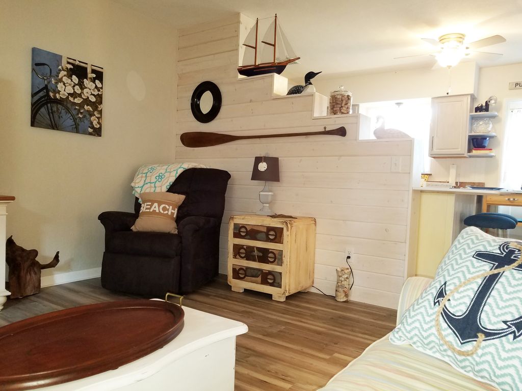 Full Kitchen with SS Fridge, granite counters, Vintage 50\'s stove! Fully equipped if you choose to cook, dishes, pans etc. Recently updated Bath with tiled shower. Towels, Hairdryer. New cool- central AC. Freshly painted and new flooring throughout. Beautiful Bedroom, sleep under the clouds, with comfortable queen bed and plenty of storage should you need it. Small porch area for reading or garden area... lounge under the coconut palms. Residential neighborhood. Enjoy a quiet respite! Loaner bikes available at several locations in town.