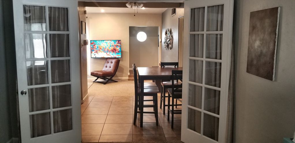 This beautiful 1940’s bungalow sports brand new furniture throughout! New 4K Roku TV for your streaming tv pleasure! Partially remodeled this bungalow sports 2 bedroom, 1 bathroom, office, kitchen and laundry room! Built in the 1940\'s this home sits on a large fenced lot, with lots of covered patio space for those beautiful winter months! The bungalow has grass in the front yard and a large covered patio with pavers in the back yard! The bungalow is a little over 1200 square feet.