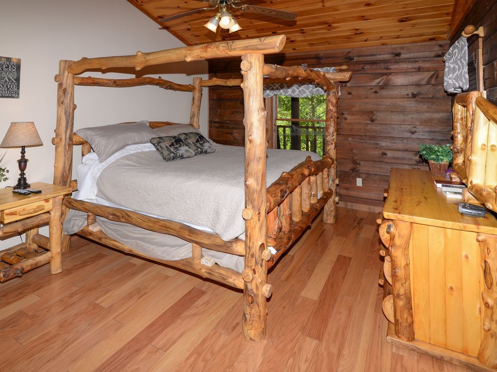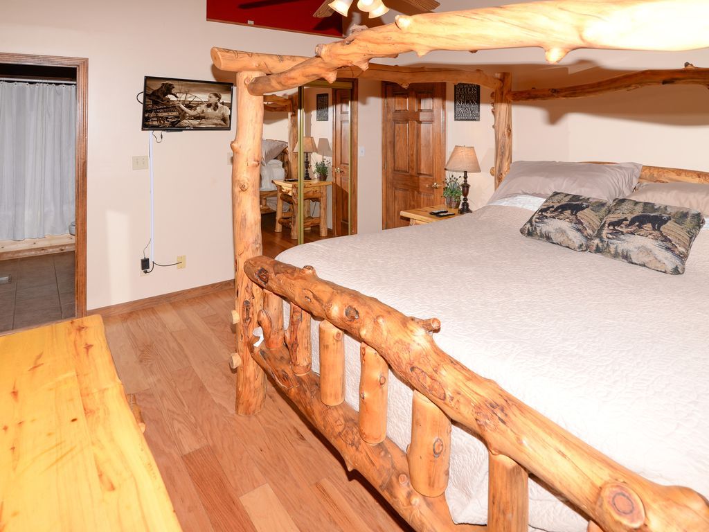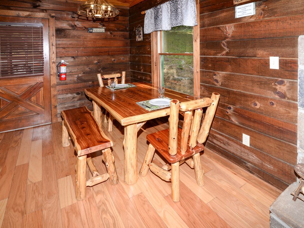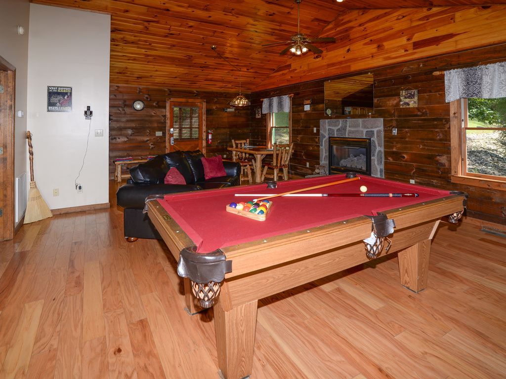 It has a private hot tub on back deck, Char coal grill for cookouts. Front porch with 2 rockers and hammock. A beautiful comfortable King bed, oversized Jacuzzi tub in bathroom, Memory Foam Queen sofa sleeper, stone fireplace, pool table, WII game system & games, HD Satelite TV, DVD player & movies.
