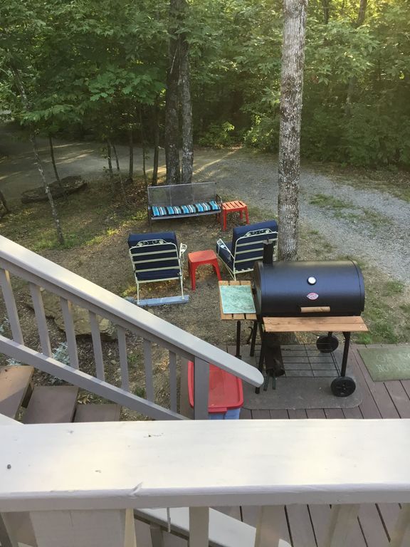 The Hideaway is a great place to stay for couples or families. Both covered porches have swings and chairs for guests to enjoy the mountain air or to watch animals in the woods.
