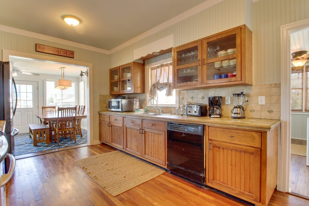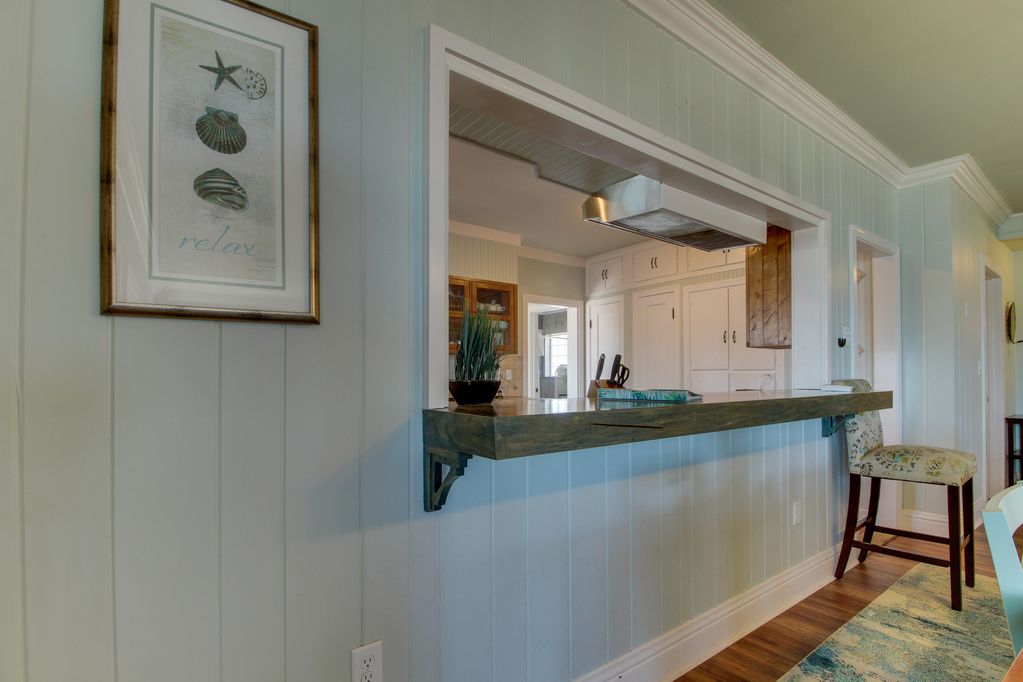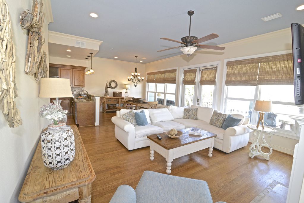 There are 4 bedrooms and 4 1/2 baths. The open first floor looks out to the pool with an entertainment area. There is a bar and seating for the perfect spot to entertain or just swing on the porch. The second level has a living, kitchen and dining area with seating for a crowd, large flat screen TV and all stainless and granite kitchen that is fully equipped. There is a bedroom with queen bed, brand spanking new mattress and large bath. Enjoy the updated laundry area with front loading HE machine. The next level has three bedrooms. Each have their own private bath. An extra large master bedroom with king bed, private porch, luxury bath and large flat screen TV make for a perfect retreat. There is also another queen bedroom and a bunk room with 2 sets of bunks. The house sleeps 10 comfortably.