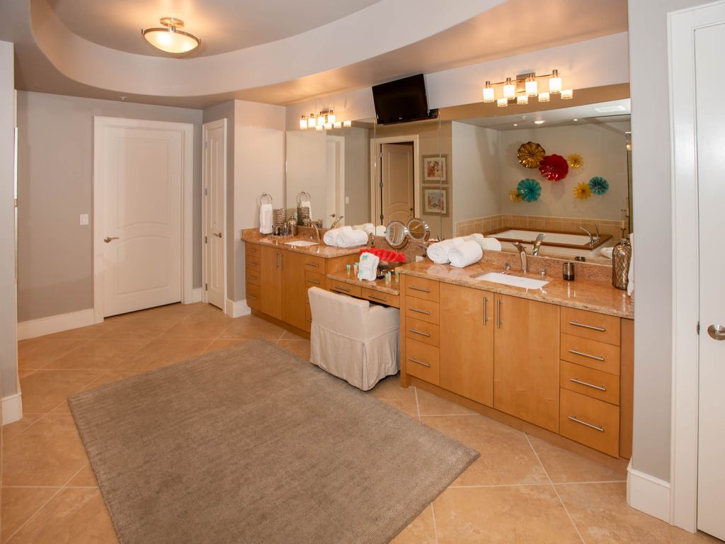 • Master Bedroom is fit for a king and queen!! Plenty of room with sitting area, desk, and all adjoins the most incredible master bath on the island! Gigantic Jacuzzi jetted and air jetted tub; his/her vanities; water closet with bidet; oversized walk in closet with access to the laundry room; flat screen HDTV; walk in shower with seat, jets, and sprayer.