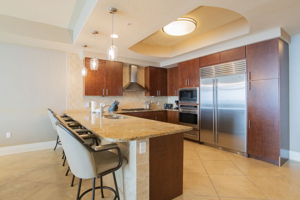 The supersized master bedroom overlooks the Gulf of Mexico through towering floor to ceiling glass windows and doors! You can also access the gulf front deck from the master suite. A king sized bed is found in the master suite along with the largest jacuzzi tub ever and a separate walk in shower. The all tile walk in shower has a seat and features all Hans Grohe plumbing fixtures including a rain head and body jets. The bathroom vanity is granite with two sinks and plenty of counter space.