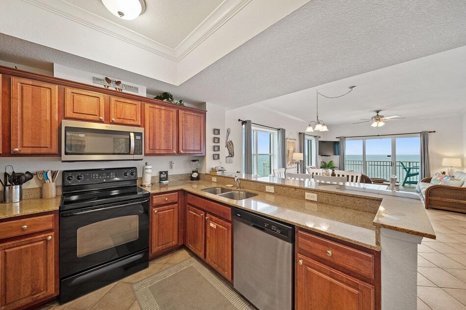 The living area, a harmonious blend of style and comfort, leads to the private balcony, where you can enjoy stunning views of the Gulf and feel the gentle ocean breeze. The fully equipped kitchen features modern appliances and granite countertops, perfect for preparing delicious meals.
