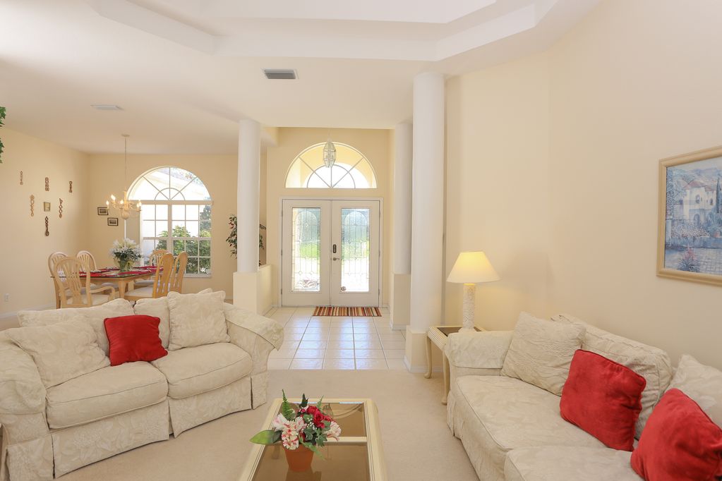 Entering this luxury home you will first see the formal living room with cream colored sofas and the most gorgeous view through the sliding glass doors of the pool area. You will also see the formal dining room with light woods and glass top table.