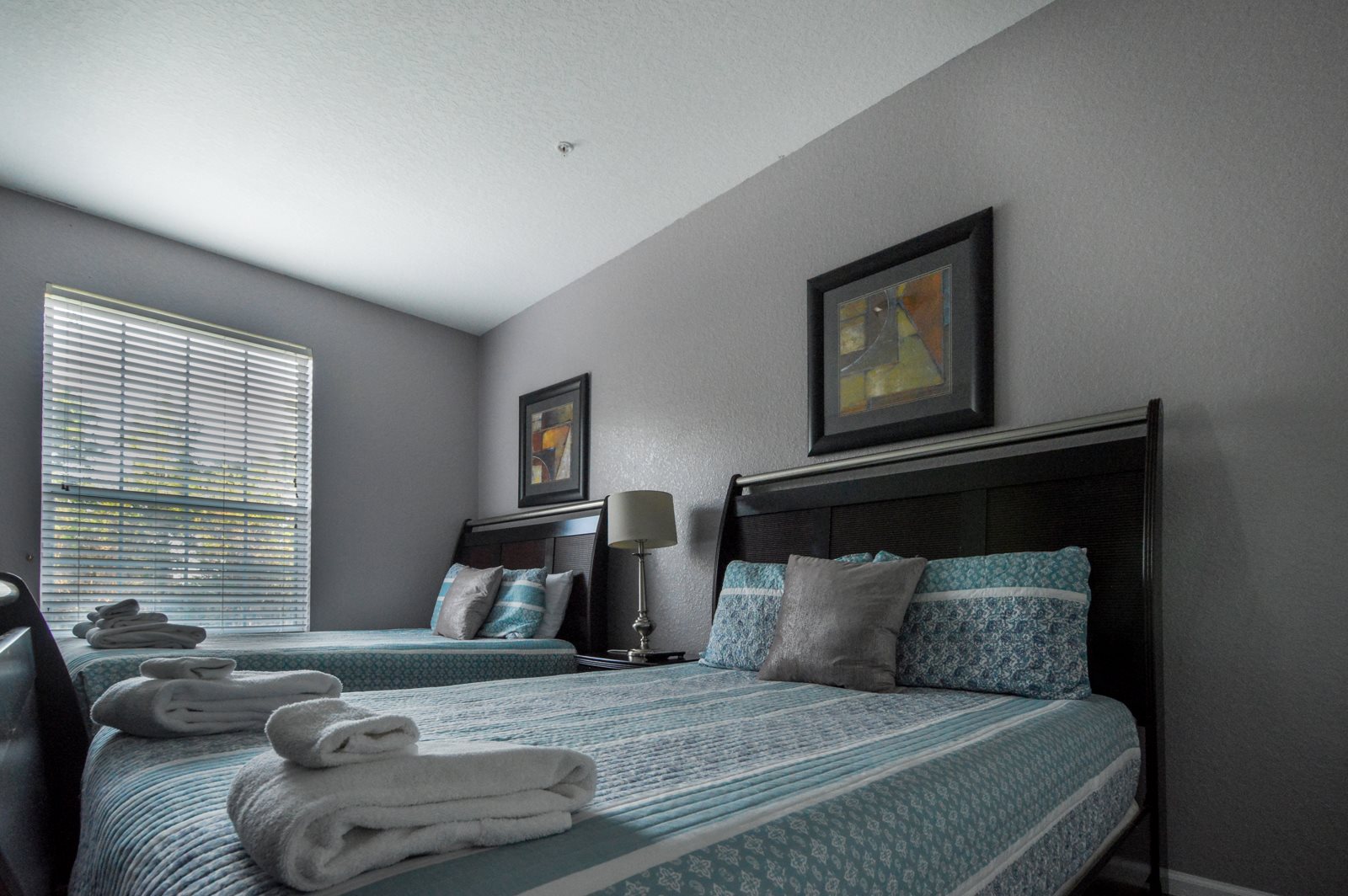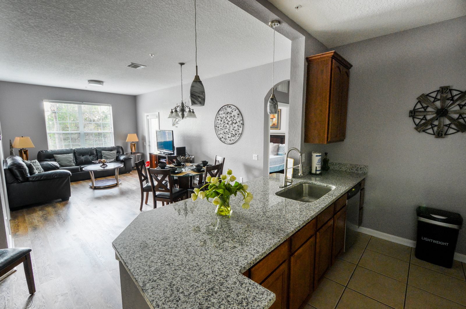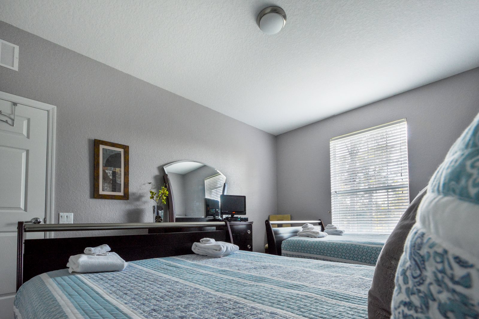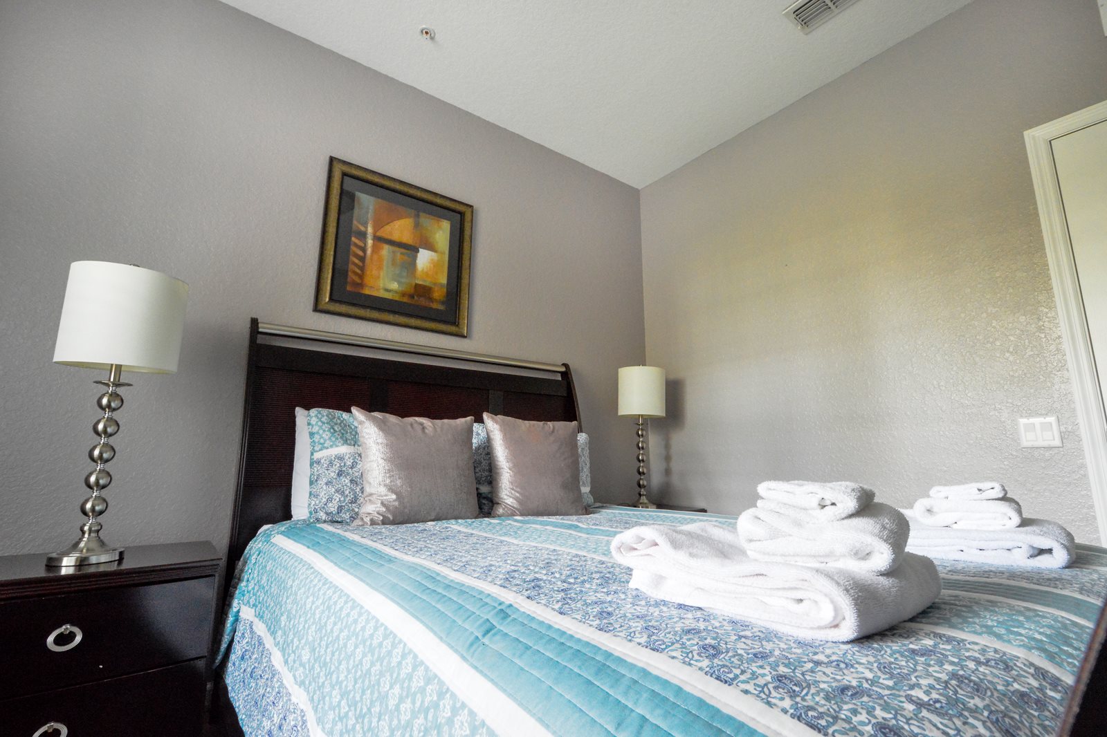After a full day of fun at one of Orlando’s many attractions you will love to be able to relax in this sumptuous, professionally decorated condo which sleeps 8 guests and features three superbly appointed bedrooms, two full baths, an open floor plan, and a fully stocked kitchen with every imaginable amenity. The master bedroom sanctuary includes a King size bed with a luxurious ensuite bath and a flat screen TV. The second stunning bedroom retreat features a Queen size bed and a flat screen TV. The third bedroom has two Queen beds along with a flat screen TV which allows everyone to enjoy their own television entertainment.