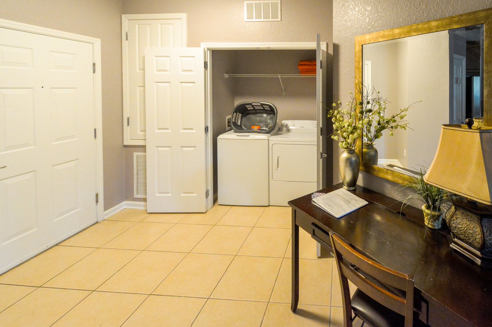 The fully furnished kitchen with granite countertops includes stainless steel appliances (fridge, dishwasher and stove) as well as a garbage disposal and other convenient appliances such as a microwave, toaster and coffee maker. Dishes, flatware, glassware, cooking pots, pans and utensils are all included. There is no need to pack enough clothing to last your entire stay as this unit features a full sized washing machine and tumble dryer in the foyer and an iron and ironing board. Linens, towels and a hair dryer are also provided for your convenience.