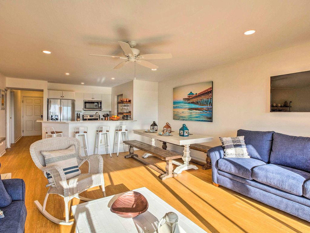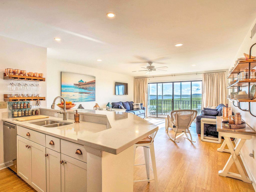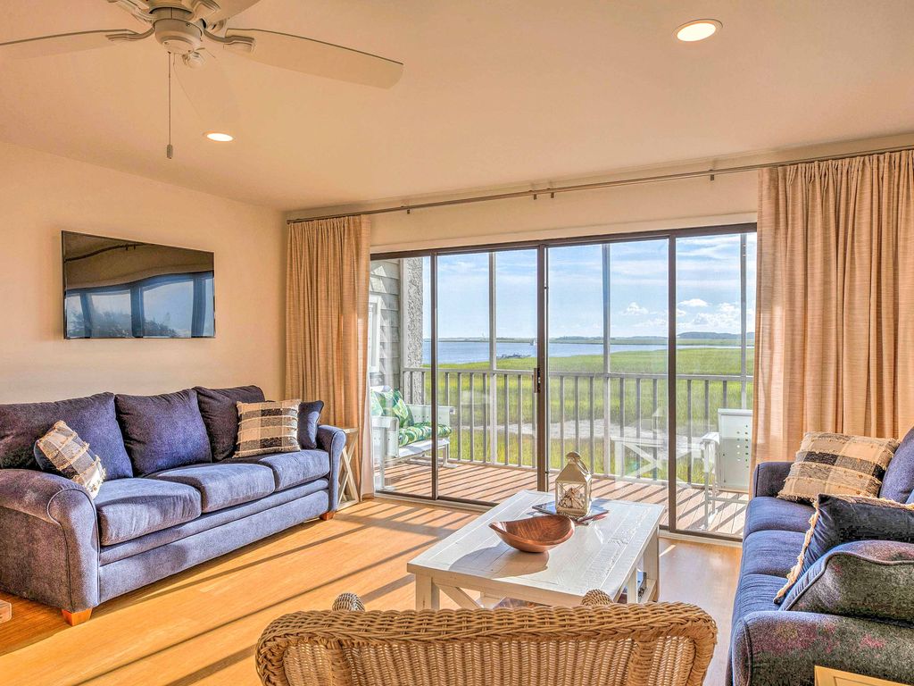 Welcome to your Folly Beach Riverside Inspiration Vacation at 93 Mariners Cay Racquet & Yacht Club where you’ll be inspired with resort-style riverfront living at this vacation rental condo for 8—including majestic river views of sailboats, pelicans fishing, and dolphins playing—with just a 10-minute walk to Folly Beach connecting you to all of the fun Folly Beach restaurants, festivals, and live music to keep you inspired and entertained both day and night. THE PROPERTY Welcome to your Folly Riverside Inspiration Vacation with majestic views of the Folly River—a wildlife sanctuary where “the river runs through it” with boating and fishing and nature’s best wildlife views. Enjoy your own private magnificent sunset views overlooking the river while enjoying a cool drink from your own private screened-in porch. Completely renovated in early 2018—You’ll enjoy luxury top-of-the-line accommodations with the best accoutrements and linens and bedding for the ultimate in entertaining and sleeping accommodations. Fully equipped kitchen with eat at bar for fun get-togethers and dining between tennis and swimming or, if you prefer, the whole gang can sit down to dinner in the lovely farmhouse dining table with designer coastal dinnerware, designed to accommodate 10-12 comfortably for dinner. This Folly Beach Inspiration Retreat is ideal for couples, families with kids, solo adventurers, business travelers, and friendly reunions. This gorgeous “like new” 3 bedroom/2 bath home boasts a beach cottage vibe with upgrades galore including custom bedding unmatched in similarly priced properties. As your host, we supply a delightful and convenient collection of “starter” toiletries and snacks to get your “inspiration vacation” off on the right foot.