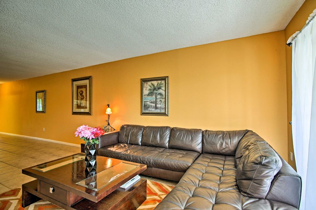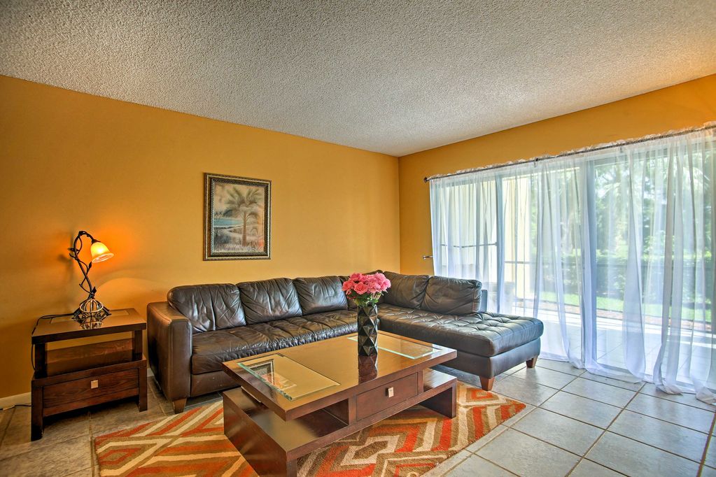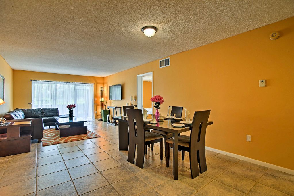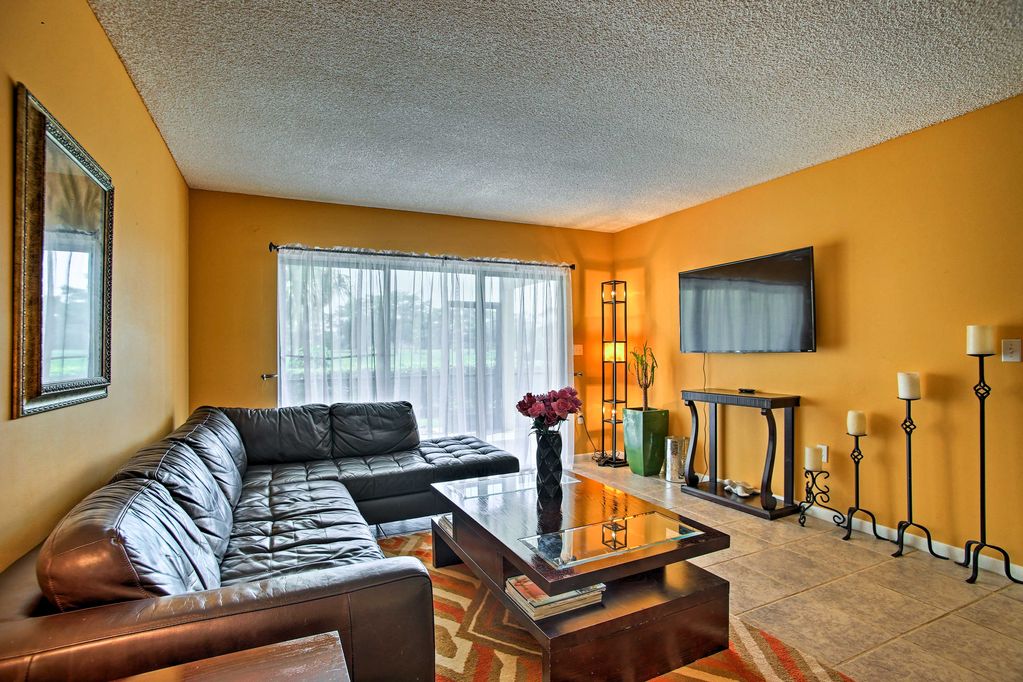 Hues of burnt orange and sleek tiled floors invite you into this home-away-from-home! The condo includes everything you need to have a comfortable stay, including a flat-screen satellite TV, free wireless internet, and cozy furnishings.