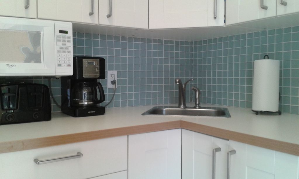 Fully equipped kitchen with electric range with oven, microwave, toaster, coffee maker, full size refrigerator.