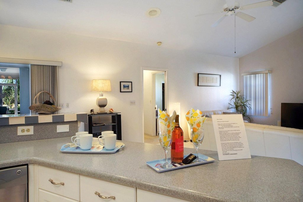 The villa has a large living area with two sitting spaces, plus dining room, and a fully equipped kitchen with breakfast counter.