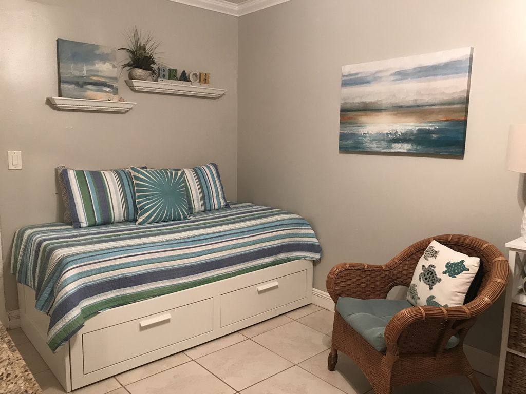 Our cozy, studio condominium has tile floors and cabinets with granite counter. We have a twin bed with a pull out to make two twin beds together. ( purchased at Ikea) You will find our studio comfortable and very clean and newly painted and decorated. It has a pool with access to the beautiful beach.