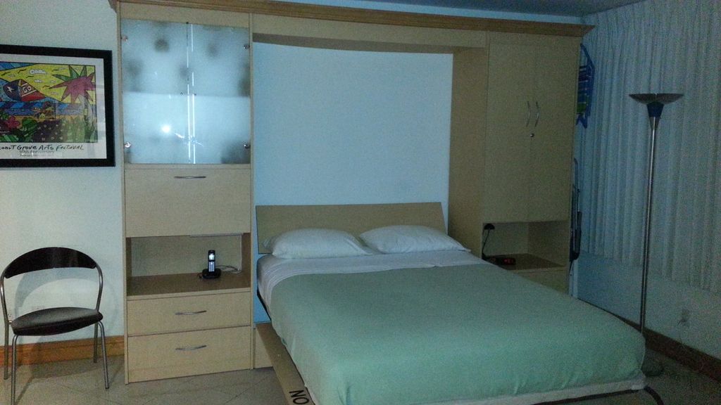This condo was professionally designed and renovated to be a Modular, Space Efficient MICRO-APARTMENT. It is NOT a \"Junior 1 Bedroom\" which compromises both the living area and the bedroom. The design maintains the huge living area and connects it to a new Office/Library via French Doors. Because of modular design, at night, they can each convert to a private sleeping area. And, each sleeping area has it\'s own access to the 3 adjacent, smaller rooms which also serve multiple purposes. These include the Jacuzzi tub/shower and toilet room, the Vanity/dressing room, and the Walk-through Closet/dressing room. Both Sleeping areas utilize deluxe, queen size Murphy Beds hidden in full walls of custom cabinetry. The Home office includes a built-in library, desk, computer, printer/fax/copier/scanner. There are color TV sets with over 100 channels (with several pay channels such as HBO included) in each sleeping area. This condo has Porcelain floors throughout and Porcelain walls in the tub and vanity rooms. The huge living area includes a dining area with seating for up to 6, a Micro-kitchen with Refrigerator/freezer, Range, Microwave, Dishwasher and smart-storage cabinets, and there is a built-in bar in the Murphy bed cabinets. This condo also features: Large hurricane/sound proof windows facing south with ocean views; High-quality, \'total dark\' drapes which allow daytime siestas. Storage includes the walk-through closet with \'smart organizers,\' built-in wardrobe closet, two built-in dressers, one freestanding dresser, and a kitchen service buffet.