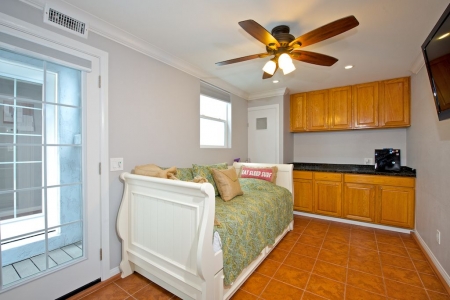The living area has a gorgeous full kitchen that flows into the dining area and living room. The living area has a fabulous, original brick fireplace, TV, DVD, stereo, and high-speed internet. The French doors open up to a private patio with a brand new, piped-in gas barbecue, outdoor dining area and brand new patio furniture.