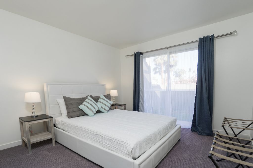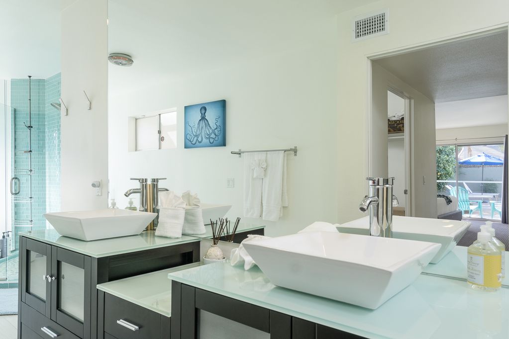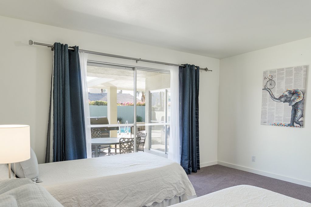Walk through the front courtyard and push open the double burnt orange doors to get start your California getaway. The tile in the entryway continues into the sitting room with a chic gray L-shaped sectional, the perfect place for sipping cold drinks and enjoying good conversation.