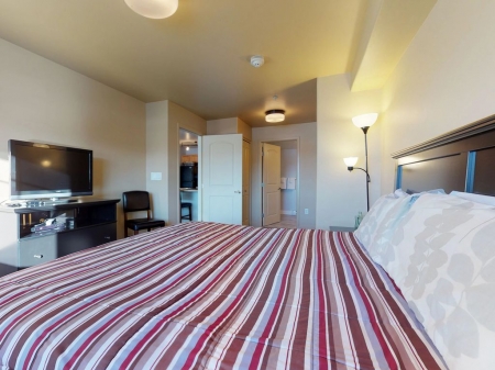 With two bedrooms and two full bathrooms, this home will sleep nine people, with a maximum of seven adults. In the master suite, you\'ll find a king-size bed with a second flatscreen TV and Blu-ray player. The guest room has a set of full-size bunkbeds with an additional twin trundle, as well as a TV and DVD player of its own.