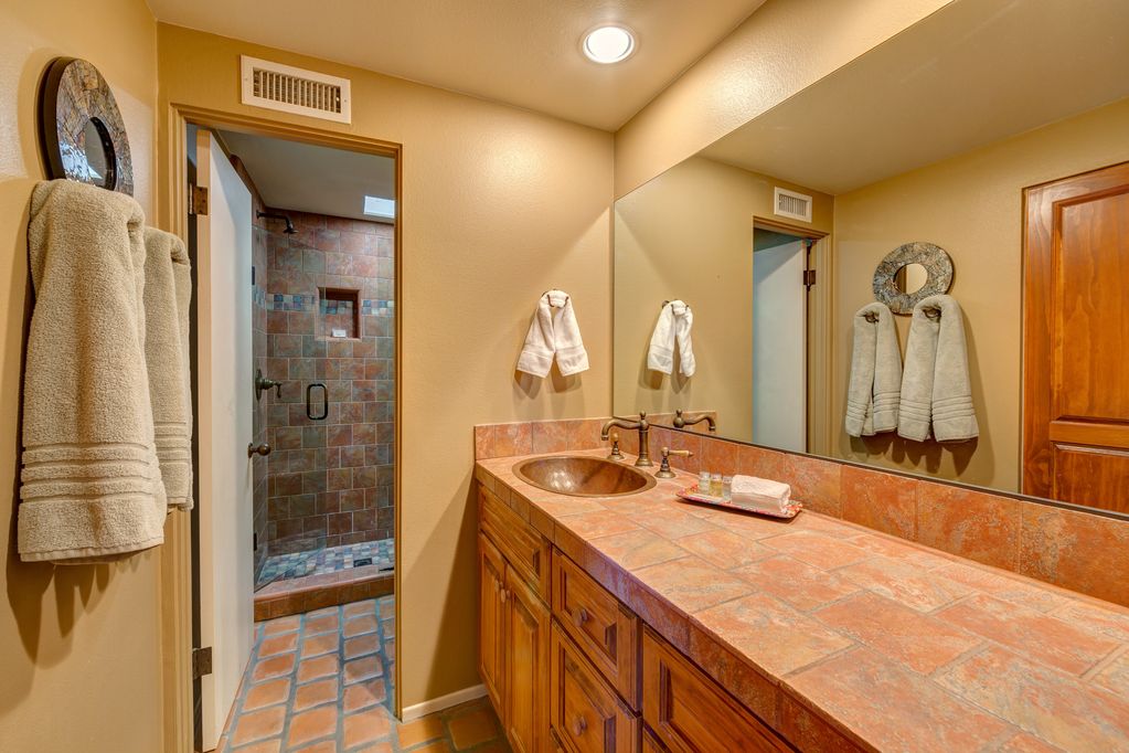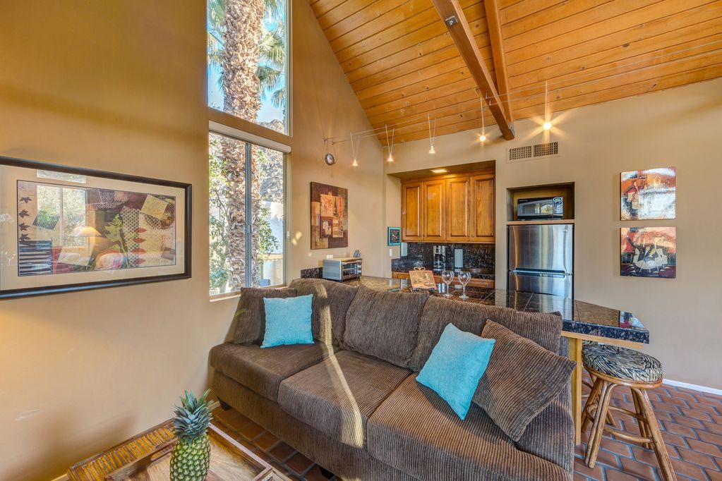 “The Caddie” ― Guests will enjoy the vaulted ceilings in this open floor plan studio. The remodeled kitchen features upgraded finishes with a convenient breakfast bar that seats two. The sleeping area offers a queen-size bed with overhead reading lights and a sitting area. There is one bathroom with a walk-in shower and upgraded finishes. The living room offers a flat screen hdtv. The small eating area and airy living room open with sliding glass doors to a large, private, covered deck, surrounded by palm trees, with mountain views. The deck features a gas barbecue, dining table & four chairs. This property is located just steps from the pool.
