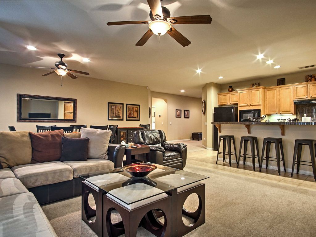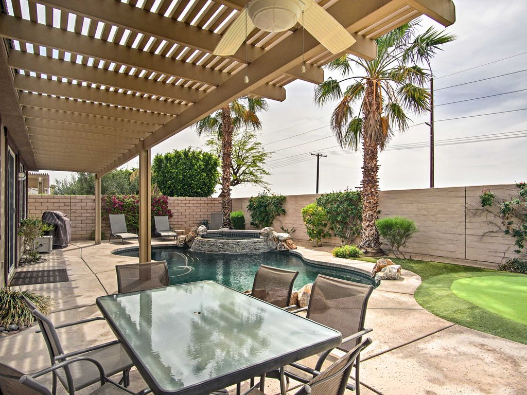Take a trip to sunny Indio and stay at this 3-bed, 2-bath vacation rental home that sleeps 8! You\'ll be treated to absolute California luxury, from the lavish interior of this upscale home to the outdoor oasis found in the landscaped backyard! Spend those lazy days lounging in the pool, putting on the private greens, and grilling on the back patio - The perfect recipe for a west coast escape. Plus the perks of a spot in the exclusive Terra Lago area, making this vacation rental a hole-in-one!
