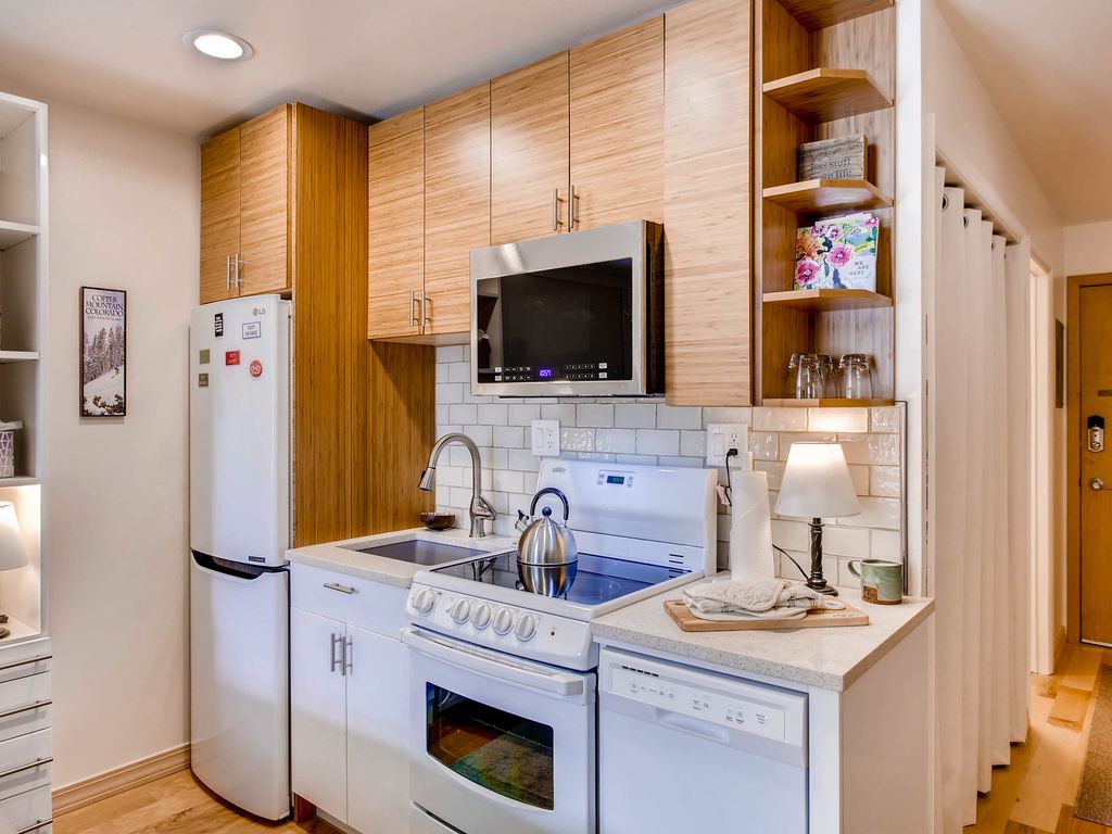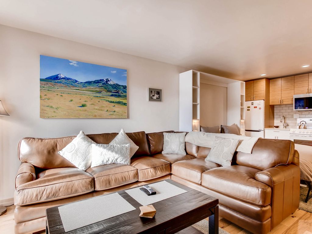 You’ll be pleasantly surprised with how nice this condo is. It’s cozy with comfortable and new furniture. The living area has a leather couch that has a double sleeper sofa hidden away. The large LCD TV with soundbar is great for watching the game or your favorite shows and the wood fireplace is a great touch that makes you feel like you’re in the mountains. A large sliding glass door provides plenty of natural light and leads to a balcony with superb views of Mount Royal and Tenmile Peak.