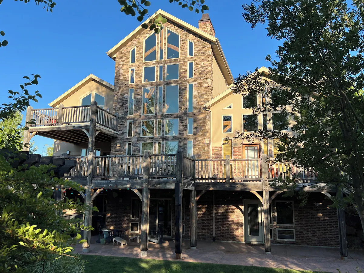 This private home is conveniently located near several ski resorts, including Wasatch Peaks Ranch, Snowbasin, and Powder Mountain, and is a short distance from Park City (38 mi). Perched on 3+ acres with majestic views of Thurston Peak and Snowbasin, this beautifully landscaped property with ample deck space offers a tranquil retreat for guests. The main floor hosts a large well-equipped kitchen, dining room, comfortable living room with oversized leather sectional and fireplace, and 2 half baths. The master bedroom with king bed is also on the main floor, and boasts high ceilings and a large en suite bathroom with a double shower and separate jetted tub. Outside the main level is an expansive deck with several living/dining seating areas and gas grill. The upstairs floor has 3 guest bedrooms, each with a queen bed, and an open office space with a queen futon, 2 full bathrooms (shared among the 3 bedrooms and office), and outside deck space. The lower level contains 2 guest bedrooms, one with an XL full bed and ensuite bathroom, and one with a queen bed. It also has a theater room with 9 reclining theater seats, bar and gaming area, and full bath. The lower level walk-out patio is equipped with a hot tub, overhead heaters, and propane grill. House amenities include Starlink WiFi, smart TVs in all bedrooms and common areas, XL washer/dryer, garage space for a large SUV, mud room, under-counter wine refrigerator, and radiant floor heating on main and lower levels.