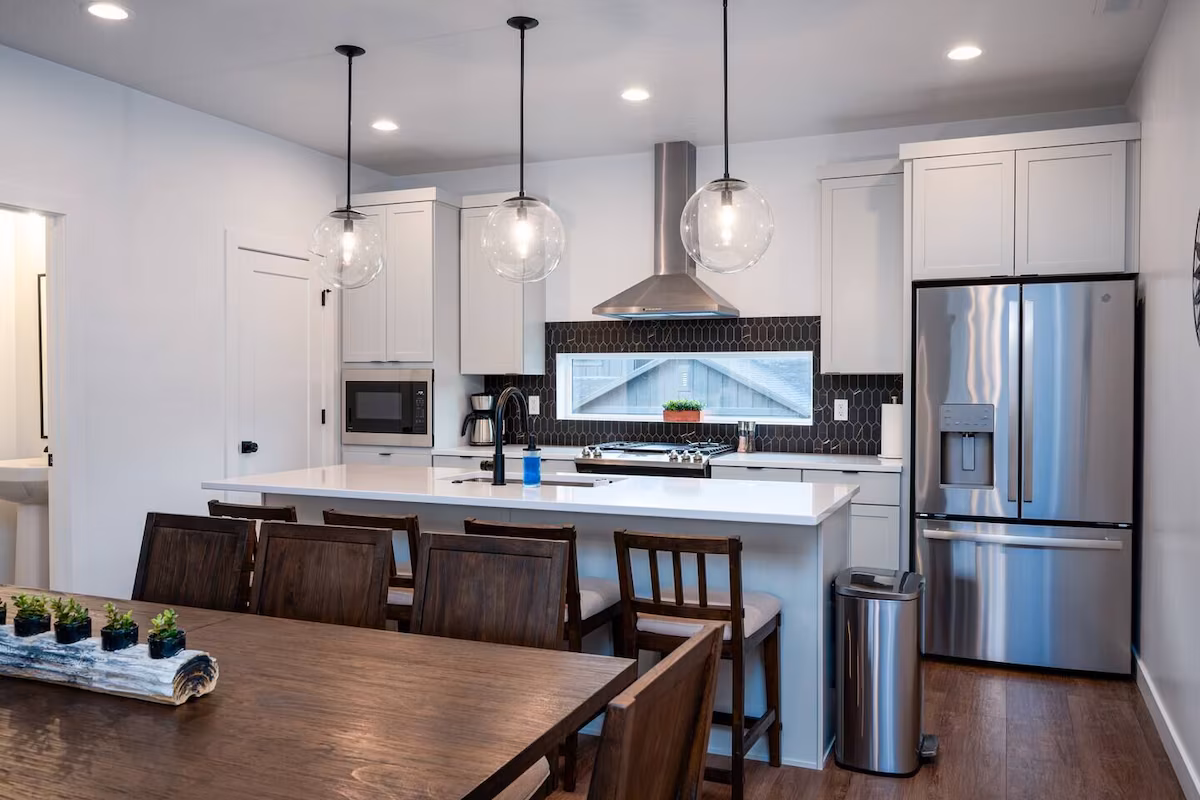 Our townhome is a haven of luxury and comfort, designed to host up to ten guests with ease. Each bedroom is a sanctuary of relaxation, adorned with high-quality linens, pillows, and towels. The interior showcases elegant plantation shutters, warm wood flooring, and subtle recessed lighting. The living space, illuminated by natural light and mountain views, features a large smart TV and deluxe seating in an inviting open layout. The dining area comfortably seats eight, with additional space for four at the kitchen island. Culinary enthusiasts will delight in the fully equipped kitchen, boasting modern appliances, a gas stove, a spacious quartz island, a large fridge, and all the essentials for crafting gourmet dishes.