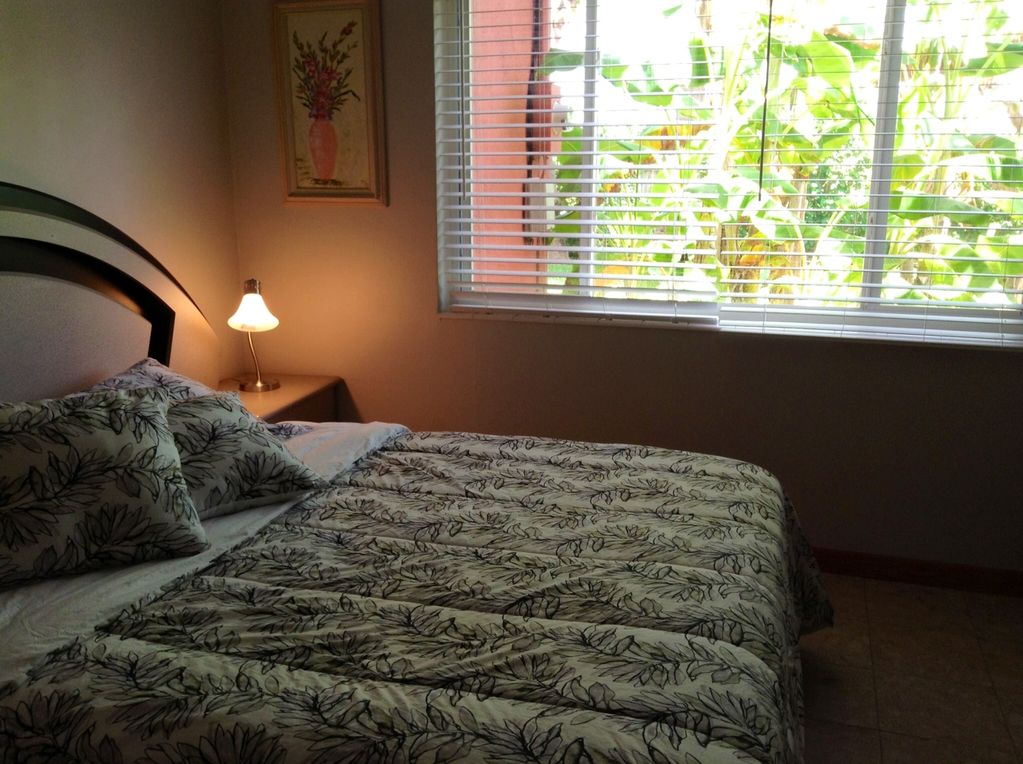A screened outside sitting area, facing the private pool, opens to a private garden with tropical Hibiscus flowers.