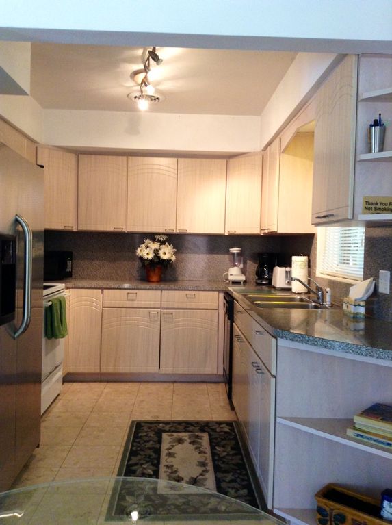 There is a separate utility room with full size washer and dryer . The full kitchen is in U shape f Fully stocked and loaded with utensils and everything you need to cook your own meals.
