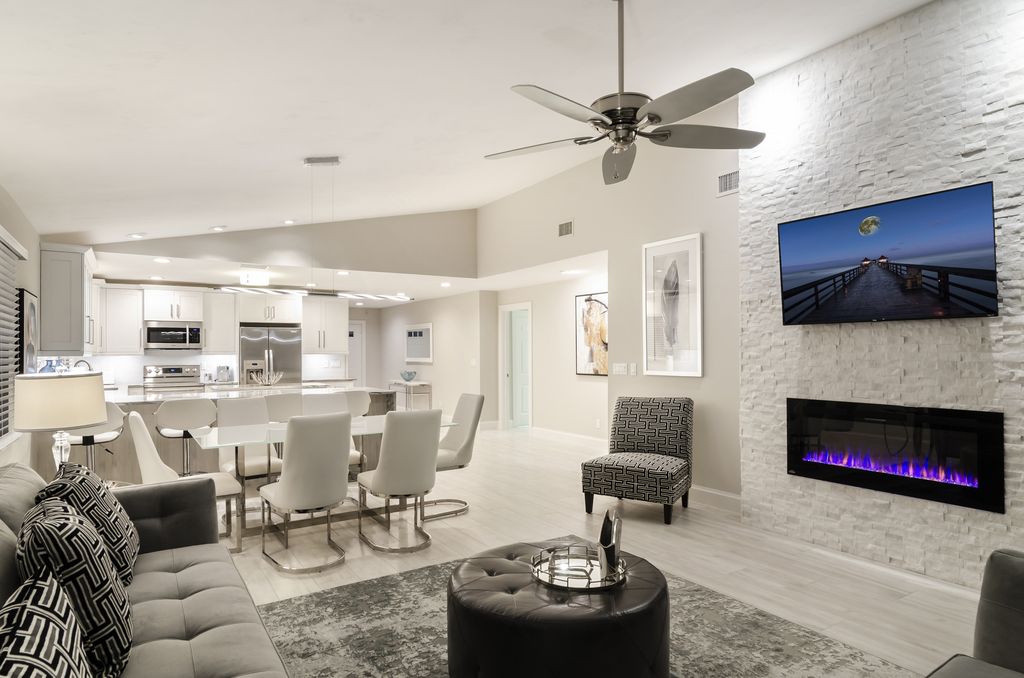 The Blue Pearl has a fully stocked Brand New Kitchen with granite counter tops, stainless steel appliances and high-end bar chairs for direct dining. The Living room features a contemporary dining and living room area with a huge LED TV and fireplace.... and wait until you go outside.
