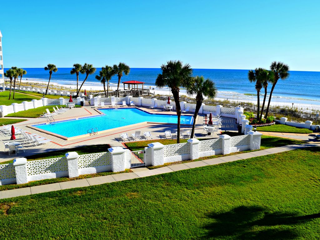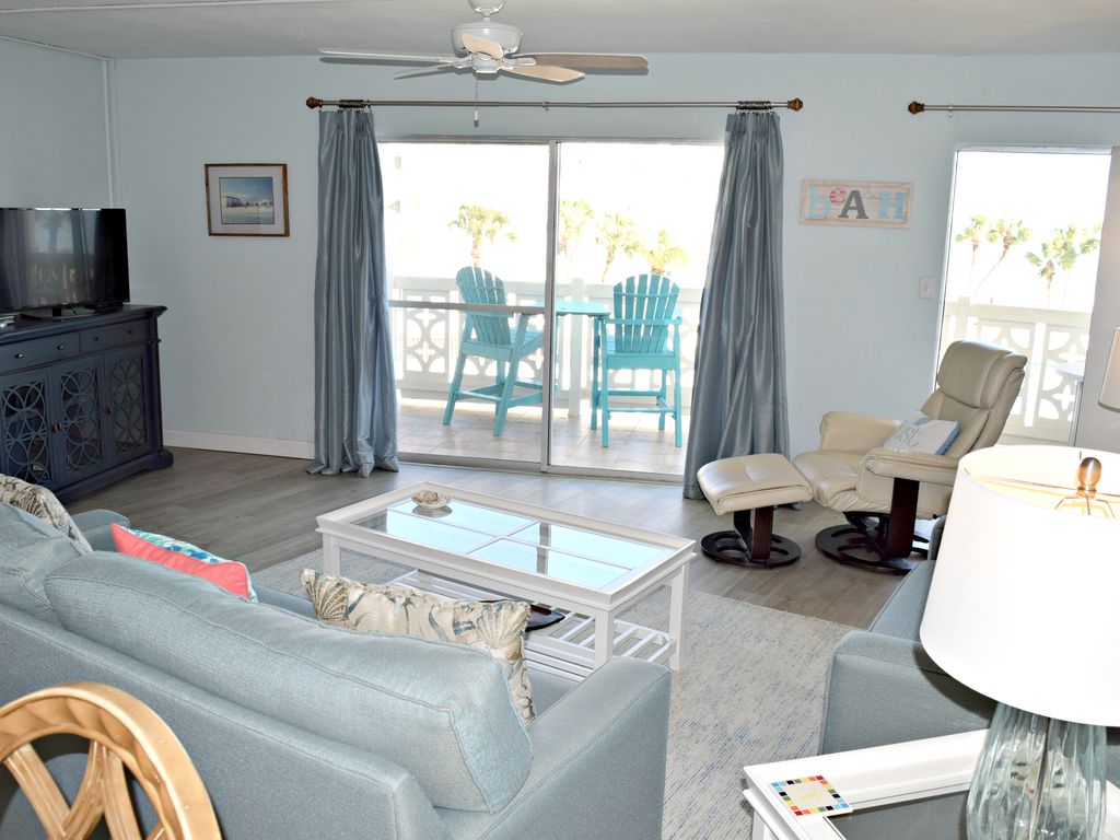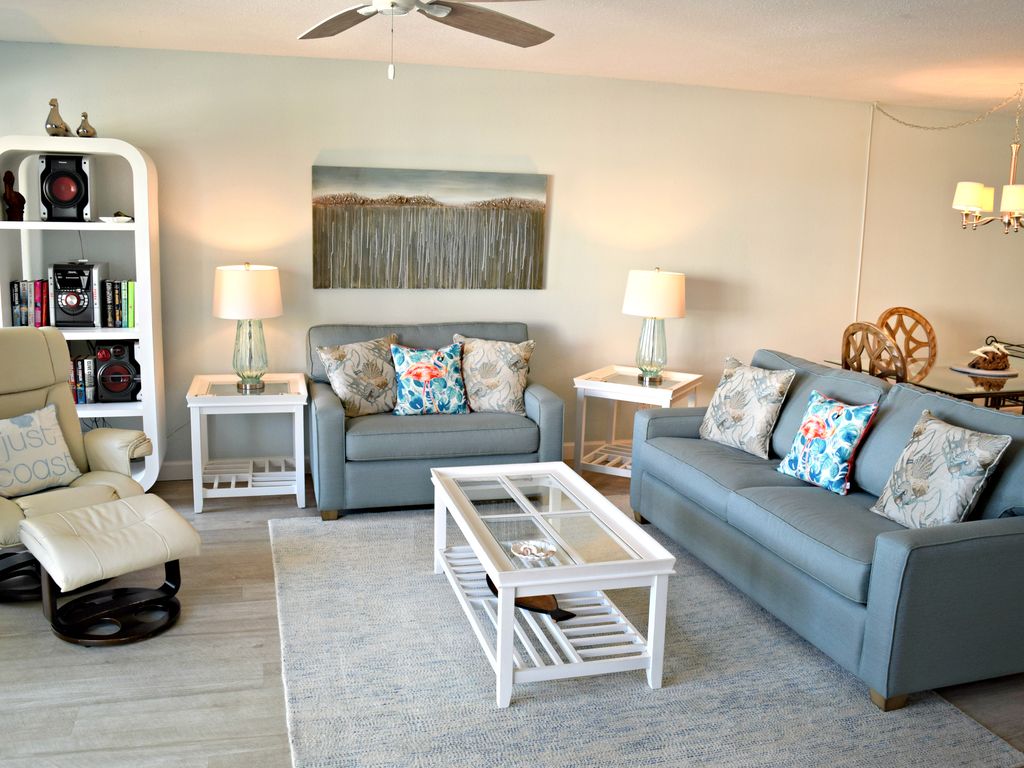 Newly updated! From the moment you step inside the door and onto the beachy driftwood flooring, viewing the interior of this lovely updated condo, you realize you have made a wise choice for your vacation residence. The kitchen is fully equipped including updated cabinetry and quartz counter tops. Comfort is the main amenity of the bright and airy living area, with a new sofa bed and loveseat, Wi-Fi, a flat screen TV along with DVD player, and a selection of books to enjoy. Ah, but a fantastic view, visible from the living room and bedroom, also awaits you on the balcony. Relax with a cool drink in the new elevated Adirondack chairs which allow a beautiful view of the gulf and pool area. The carpeted bedroom, with lots of closet and drawer space, features a comfortable king- sized bed for a good night’s sleep. The bathroom features an additional closet and has newly installed cabinetry, sink and quartz countertop. Awaken to a beautiful view of the beach and get ready to have a wonderful relaxing day in your own Gulf Dream.