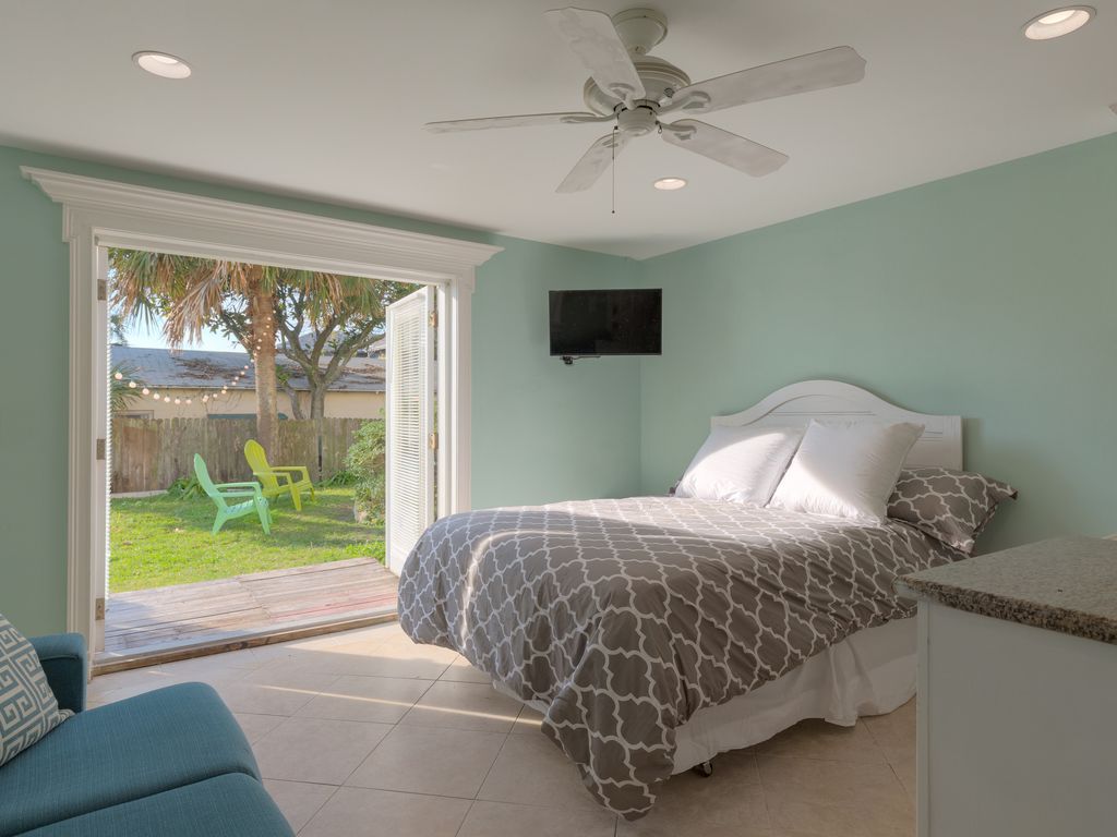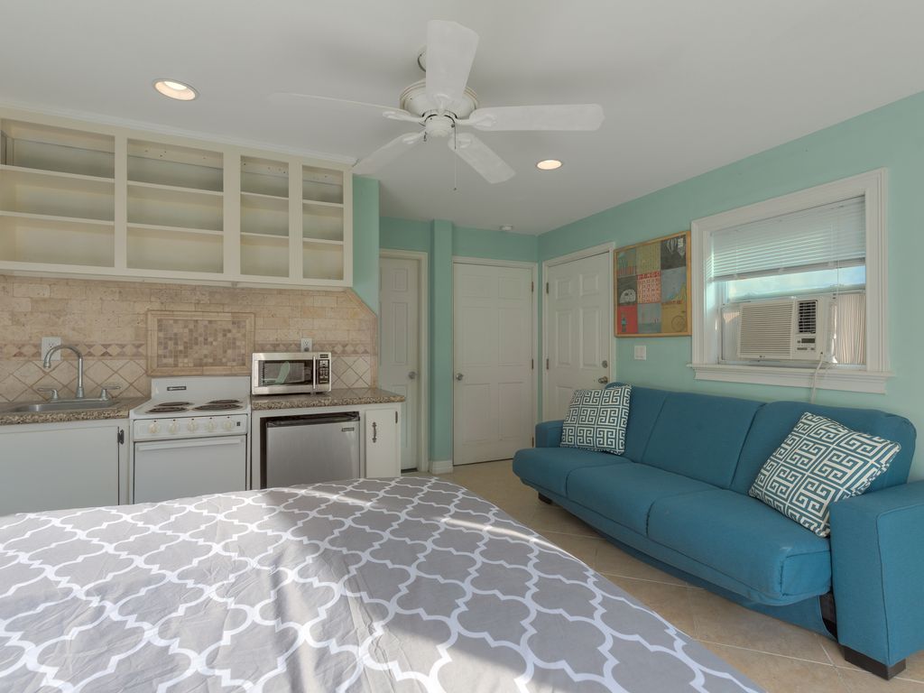 250 sq. foot studio apartment, with a queen bed and comfortable sleeper sofa, small dining table for two, a spacious closet with room for storing clothes and suitcases for longer stays.