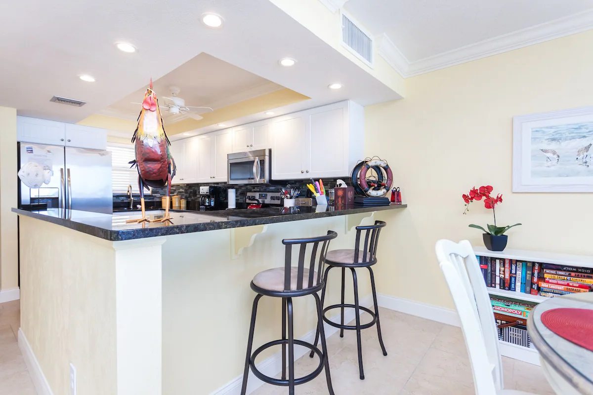The beautiful kitchen features stainless steel appliances and a great amount of counter space. It is fully equipped with a dishwasher, microwave, refrigerator and freezer, stove top with oven as well as cooking and eating utensils to create your own delicious meals during your stay. The breakfast bar offers seating for two with an additional dining area with a dining room table and seating for four. After dinner, take a step out on the balcony and enjoy the sounds of nature and the peaceful ocean view from the chairs.