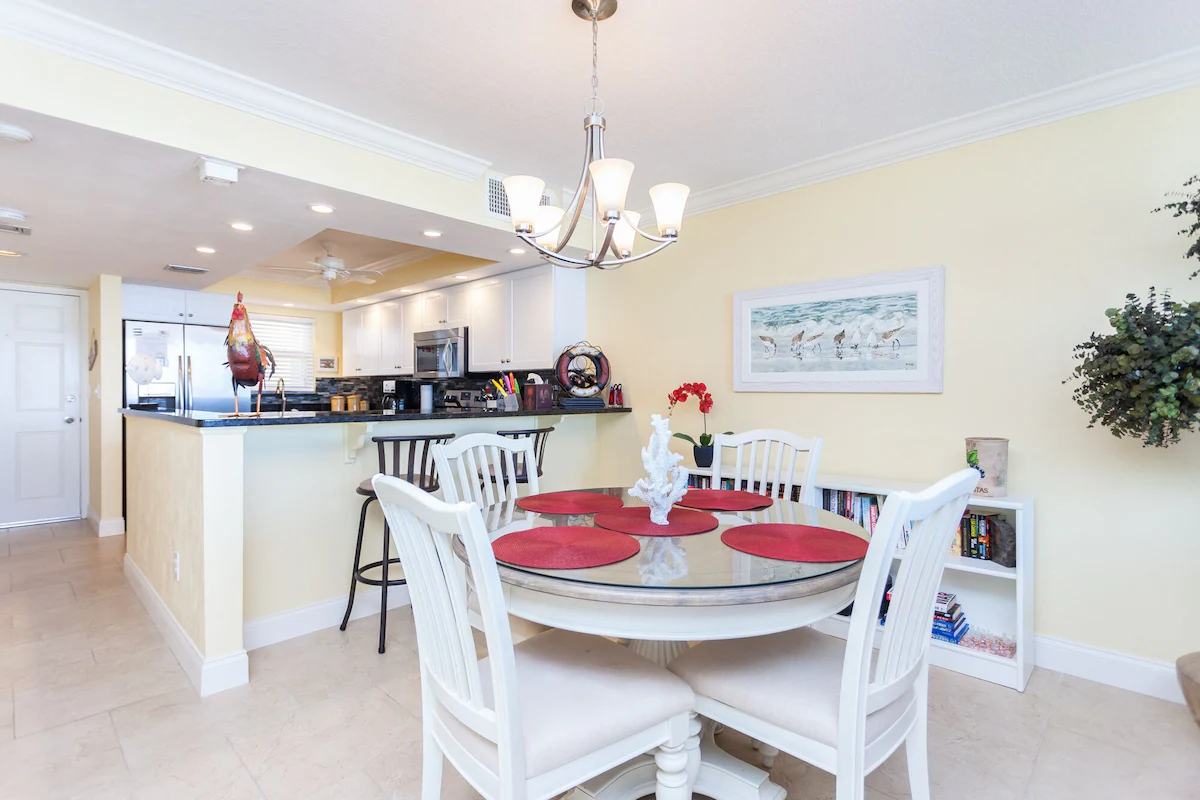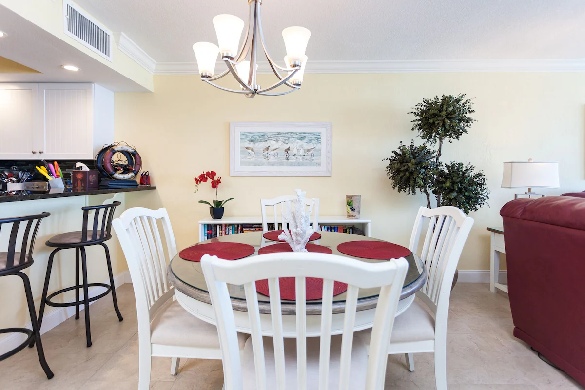 When you enter Shores Club 505, you will enjoy the bright and cheery feel with a great open floor plan with immediate views of the ocean. The living room offers a large sofa and loveseat positioned around the large flat screen television. You and your guests will love this airy and spacious living room with the large windows and sliding glass door to the balcony. Feel free to relax on the sofa after a long day in the hot Florida sunshine!