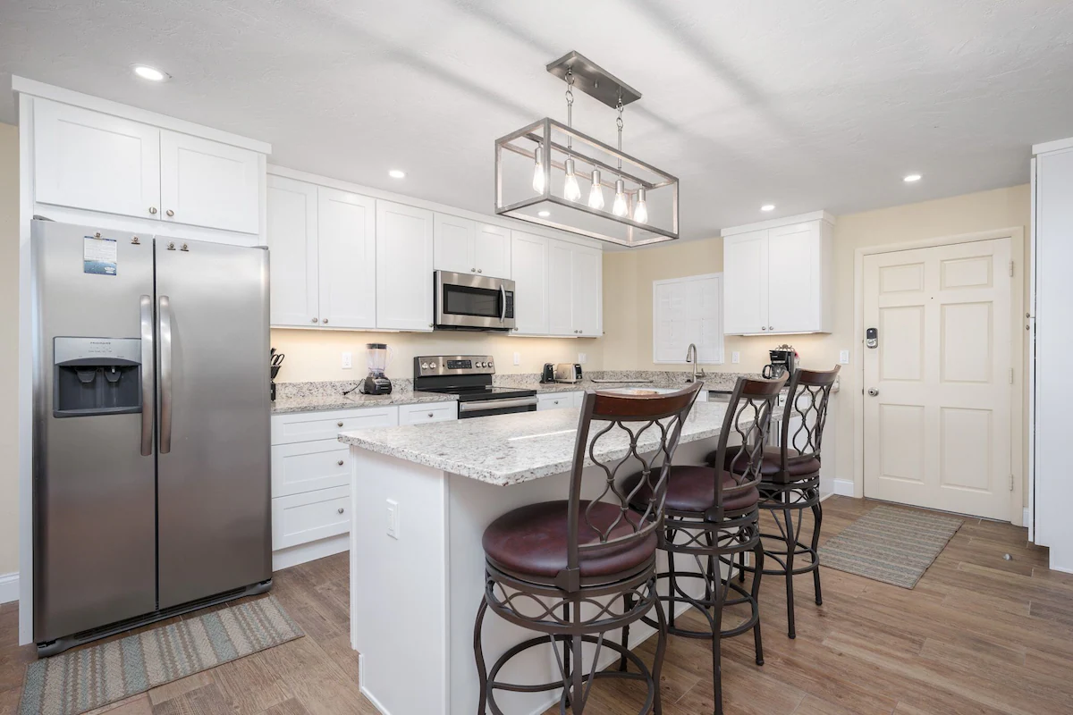 The fully stocked kitchen features white appliances and plenty of counter space. It is fully equipped with a dishwasher, microwave, refrigerator and freezer, stove top with an oven as well as cooking and eating utensils to create some delicious meals during your stay. The breakfast bar offers to seat four with an additional dining area with a dining room table and seating for four. After dinner, take a step out on the balcony and enjoy the peaceful sounds and view of the ocean.