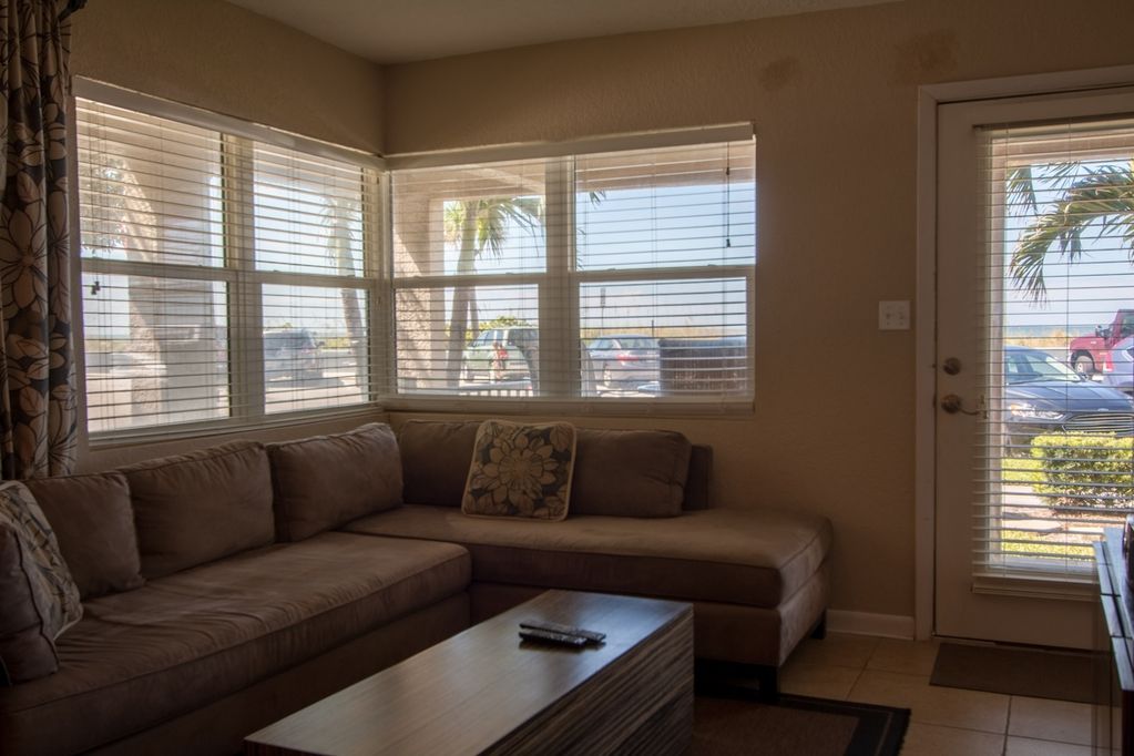 The entire condo has been updated with tile and wood floor, granite counter-tops, and stainless appliances. The large private master bedroom features a comfortable Queen-size TempurPedic bed, and the second bedroom sleeps additional guests with a comfortable \"Murphy\" style Full-size bed which can be folded away for additional space. The living room and private Gulf-facing patio give a beautiful view of the water and the Sunset over the Gulf, and the large couch is generously big enough for a nap after a long day on the beach.