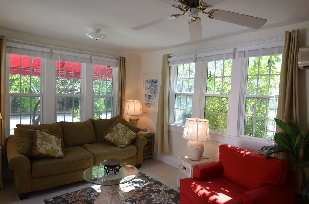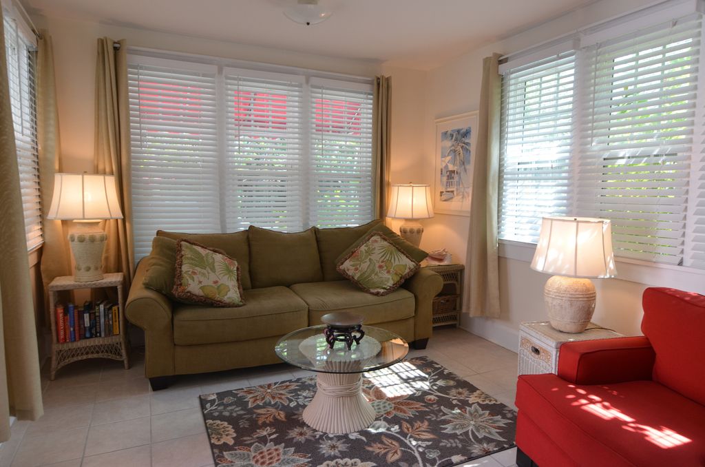 The living room, decorated in Floridian style, has a sleeper sofa and arm chair along with a large flat screen TV and wicker desk with a high speed internet connection. A closet provides additional storage for clothes. Central AC provides cooling and heating.