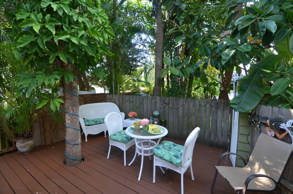 The Gulfside Bungalow has French doors that open off the bedroom onto your own private deck surrounded by palm trees and flowers. Breakfast outside, grill dinner on our BBQ, or just read in the lazy afternoon on our spacious new deck.