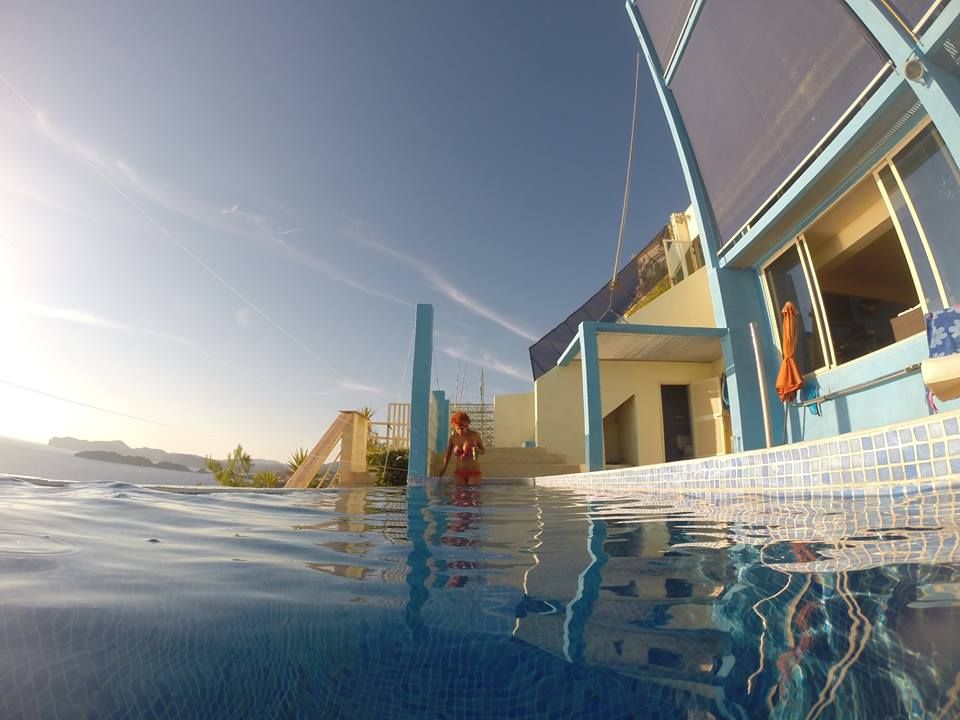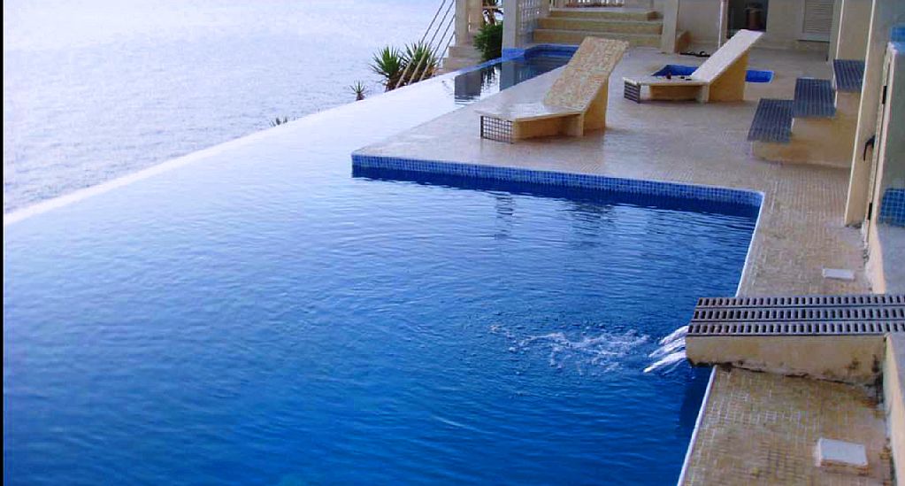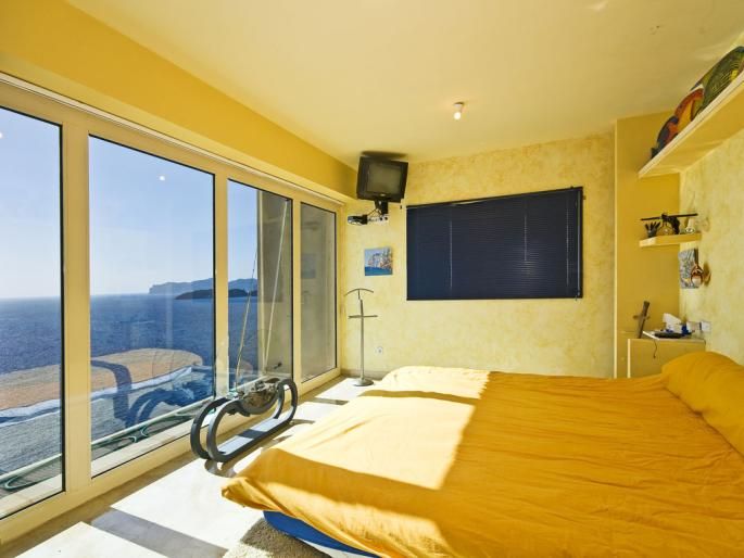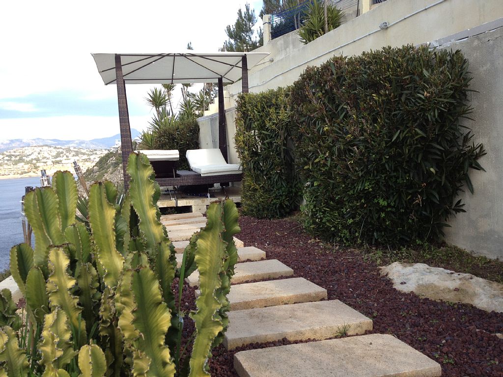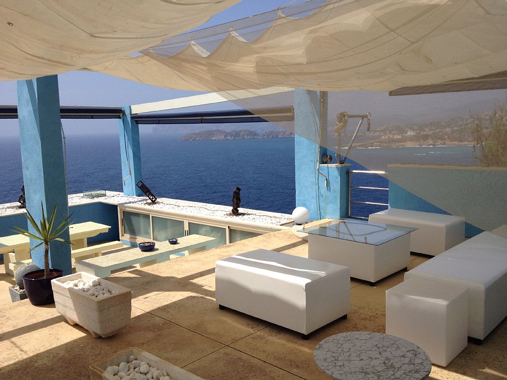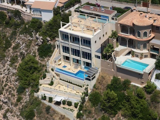 Marina&Golf. Villa in Port Adriano / El Toro, close to Santa Ponsa, between Portals and Port d'Andraitx, 15 km away from Palma de Mallorca by expressway and road. Located in a quite surrounded area during both, night and day periods, even in Summer. It has the benefits of every sort of facilities as beaches, marina bay, golf courses, private clubs, sports, church, medical centre , pharmacy, supermarket and various shops, as well as bars and restaurants of different styles and qualities. This villa is located on a cliff facing the West, with fantastic views over the sea from every single bedroom and terrace in the house. This very modern house offers an avant-garde decoration and building concepts as optical cabling, bioclimatic optmization,... and its architecture and construction is based on minimalistics statements. The mega-loft. The house has an street level entrance where we can find parking place for three to five cars, as well a chill out terrace with massage&hot water bath facilities, plus a hudge full equiped barbequeue & oven-kiln also for solarium and parties, summarizing a total of 500 sq metres. Due to the fact that the entrance remains on the top floor, the villa has an absolute privacy from external viewers. The inside is based on a loft concept, with open rooms and glass decoration items. All shadow roofs are automatic. As we go downstairs we have the night level, which consists on the port side of two single bedrooms -upgradeable to twin-, one double bedroom, a full equiped gym, and a big bathroom. On the starboard we have the master bedroom of 80 m2, with massaged water bed and two walk-in wardrobes, en-suite twin bathroom, jacuzzi, and inside garden, and Panic Room (never in 10 years had a single use). Going down again you reach the day level, with an inox decoration kitchen with sitting breakfast place, a washing room, a toilet on the stern, and on the for we have two open study rooms, 2 living rooms and one dining room, pets house, cinema & game space, as well as equiped covered terraces. An elevator from the port terrace ups to the chill out at the level street. Normally it's used for gods and heavy things, but can eventually carry persons. Again if we go one more floor downstairs, we can find the swiming pool with solarium, and a multipurpose espace with a full equiped spa, winter heated pool&big party room (configurable ) of 100 sqm, equiped for parties. From there onwards several terraces with 300 sq m2tres alkable gardens, which looks like if you where walking by a boat board. Its remarcacable the Zen Space in the last terrace, with a twin external bed and stones-ligthed garden. For reaching the seaside there is an external stair, but has not beach or private deck for boats, because it's on open waters.