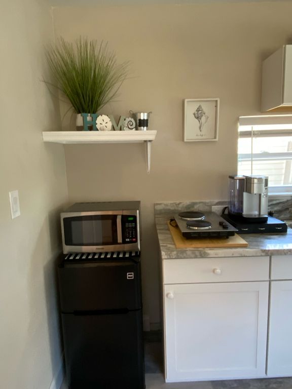 The well stocked kitchen has a medium size refrigerator, microwave, coffee maker, a 2 burner stovetop, no oven.