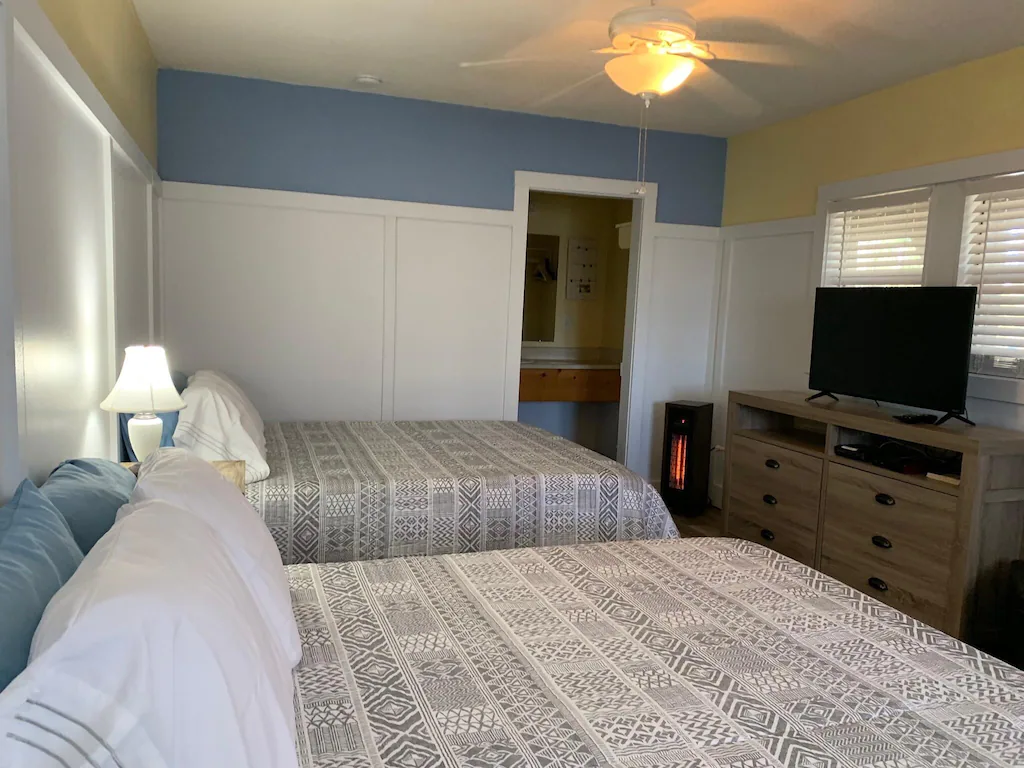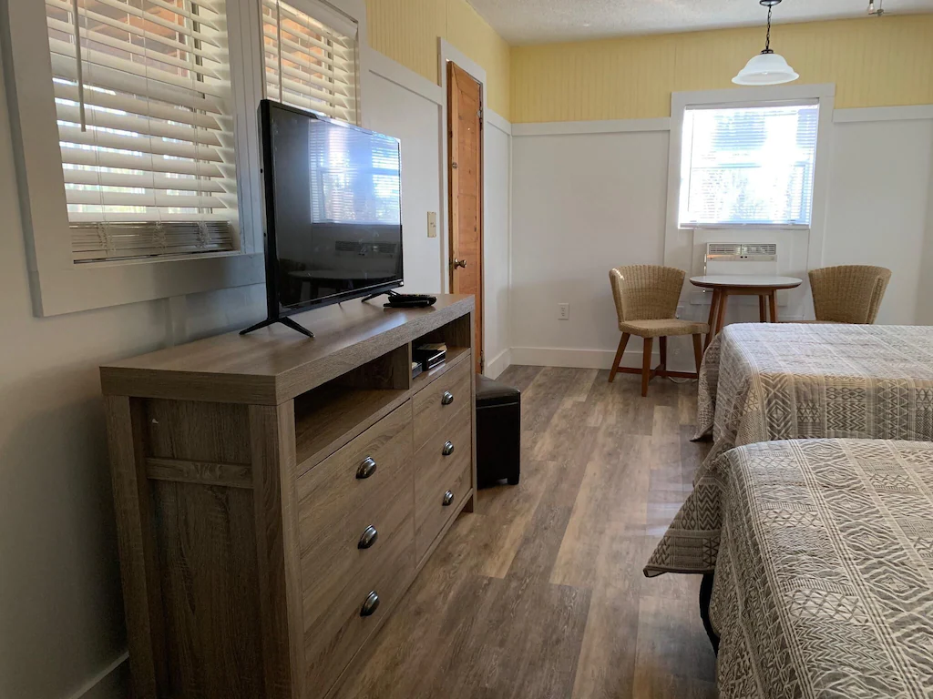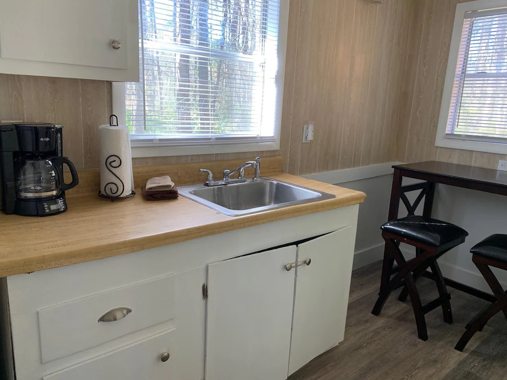 The South Cabin is a large one room with one Queen Bed, one Full size bed and a sitting area with nice TV, Cable and Wifi. A small kitchen off the room has sink, apartment size fridge with freezer, microwave, toaster, coffee maker and ample supply of dishes, etc. Has small bar to sit. Has charcoal grill outside. One bath with shower. Large screened porch to enjoy the days...and nights. Wildlife is still here. The cabin is nestled among the oaks, pines, palms and palmettos at the Old Saltworks Cabins, a civil war historic site. Seclude and quite here and just a short walk to the bay to enjoy a day on or \'in\' the water. The bay is hard pack sand bottom, pristine waters and great for all water activities, fishing, exploring. Shallow for a ways out so you see so much! Children love it. (pets and parents do too!) Great place to call home and explore the Cape.