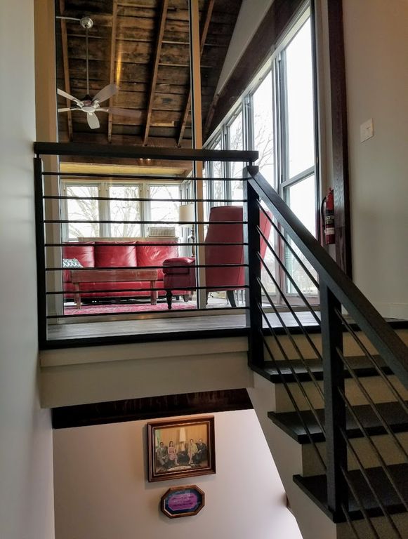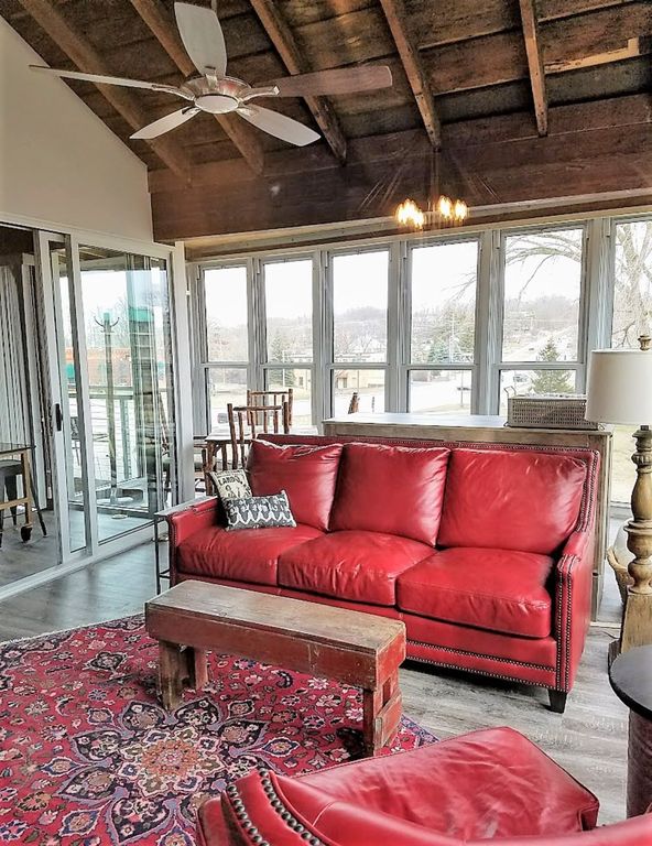 The most exciting vacation property in Southern Wisconsin! Located on Main Street in downtown Lake Geneva, this former bland office building has undergone a ground up restoration that will sleep 20 with 9 bedrooms , 7-1/2 bathrooms. Architecturally edgy and contemporary on the outside with great gathering spaces on two decks and four season room. The interior showcases a mix of industrial design, creative furnishings and flea market finds. The large open concept living area has 16 ft. of dining space, a spacious kitchen and entertaining area/living room with 65 inch HD Flat screen TV. Each bedroom has a signature style of it\'s own, offering the highest level of comfort and privacy. Top of the line mattresses, pillows and luxurious linens throughout. When you are ready to escape the group, each bedroom has a large HD flat screen TV. Seven of the nine bedrooms have a private bathroom (the remaining two bedrooms share a bath). Each bathroom features a rain shower and one of a kind furnishings.