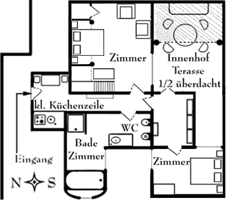 A bedroom with a double bed (2m x 1.50m), with a small table and 2 upholstered rattan armchairs, a walk-in closet, a chest of drawers, a powerful ceiling fan, digital satellite TV with over 30 German TV programs and over 30 German radio stations, a single bed in the gallery (for children only), direct access to the inner courtyard;