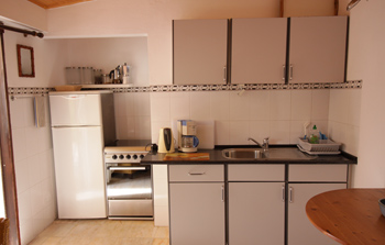 A fully equipped kitchenette with large refrigerator, 4-burner gas stove and oven, coffee machine, toaster, kettle, various electric appliances and dining area with table and chairs.