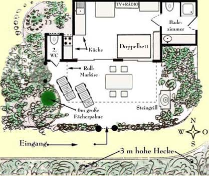 A terrace facing east + south + west, approx. 7 x 5 m, surrounded by plants + offering natural shade with teak table, armchairs and sun loungers with cushions (padding), roll-up awning, stone grill + external 2nd toilet;