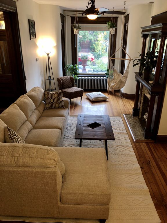 We can comfortably sleep 7-8 guests in our sprawling space. There are 2 queen sized beds, 2 full sized beds in each bed and 2 full bathrooms. Each bedroom has large windows providing loads of light, and contributing to the Victorian style architecture. Beautiful chef\'s kitchen with state of the art appliances is like walking into a chef\'s dream!